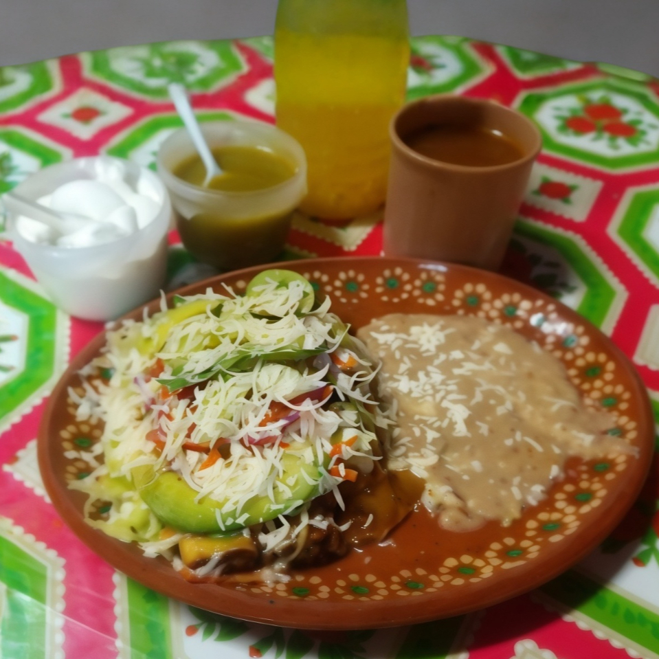 Orden de 3 enchiladas, elige la carne, lleva lechuga, zanahoria, cebolla, tomate, pepino, aguacate, queso rallado, crema, salsa, frijol y consomé.