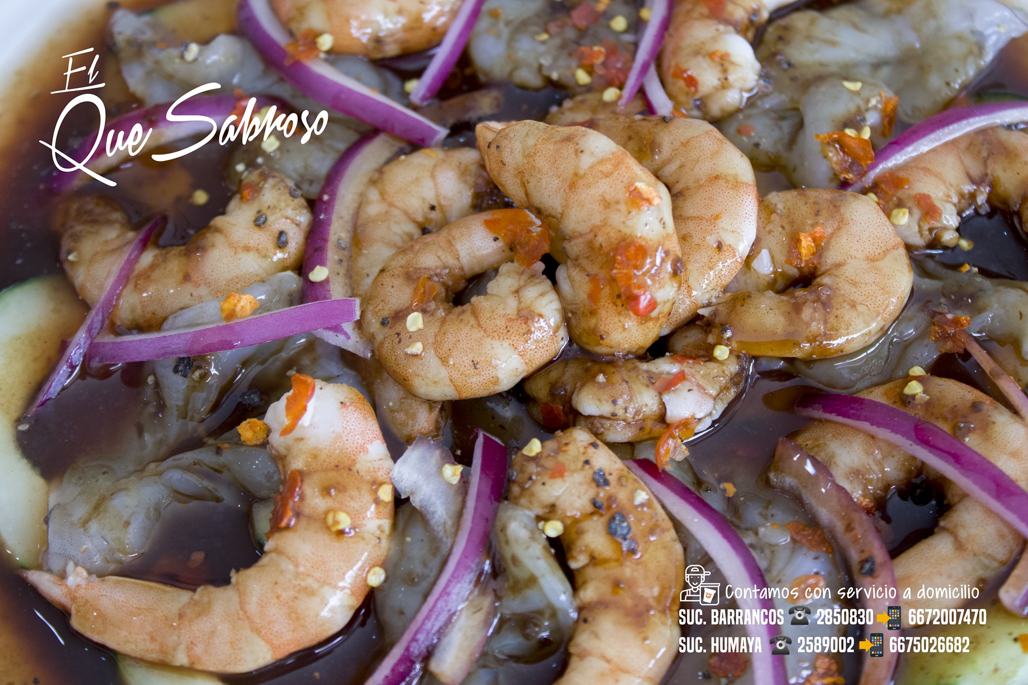 Camarón cocido y crudo bañado en salsa de chile serrano