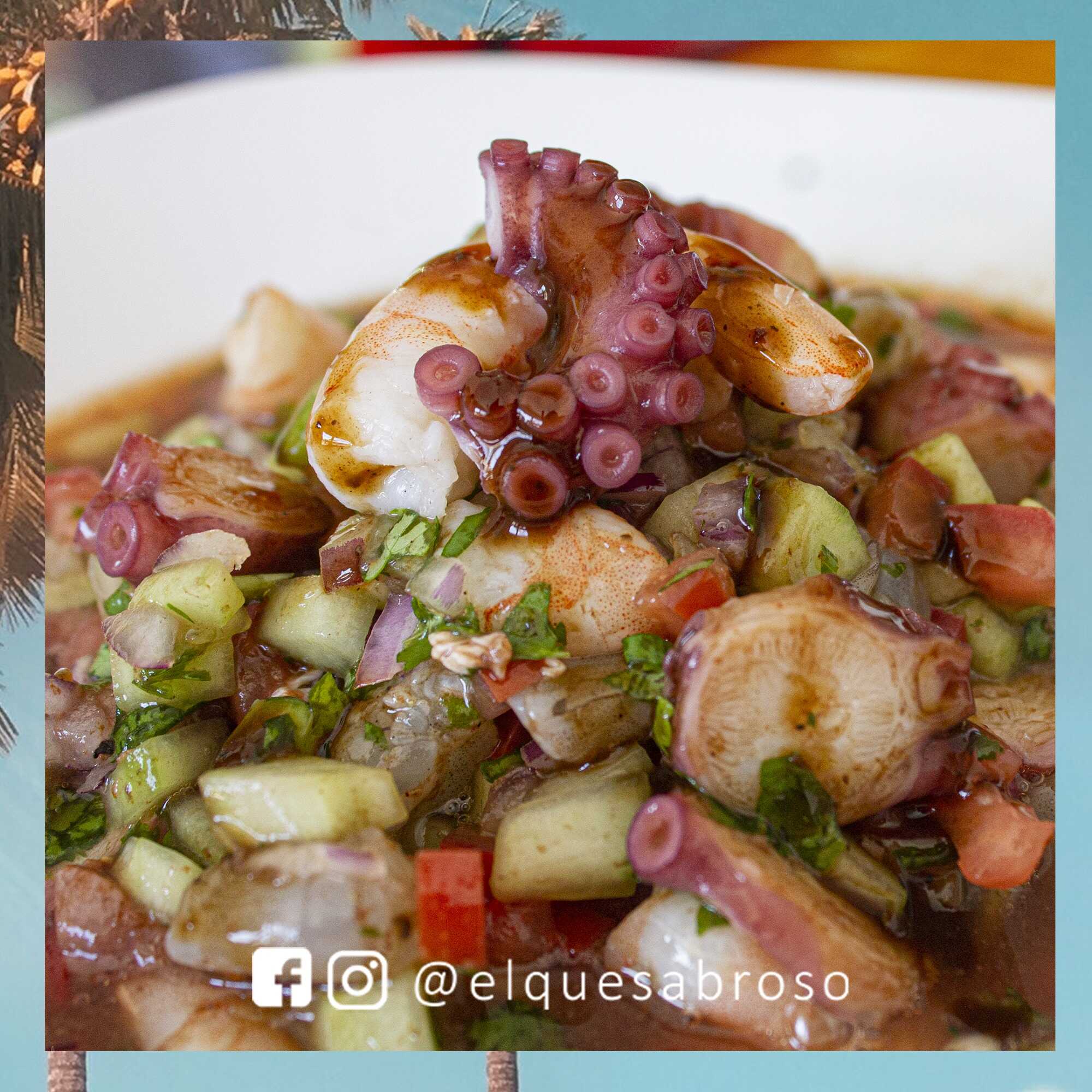 Camarón cocido, camarón crudo, pulpo, y atún curtidos en limón pepino, cebolla, tomate y cilantro