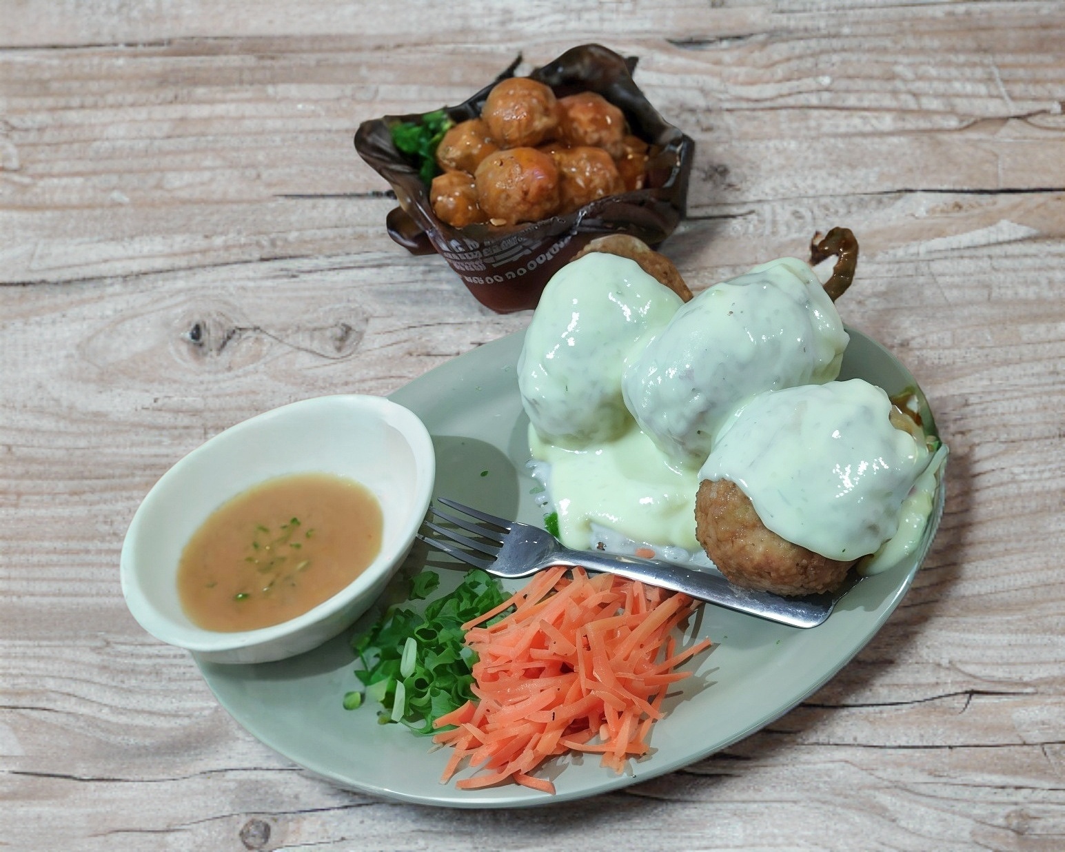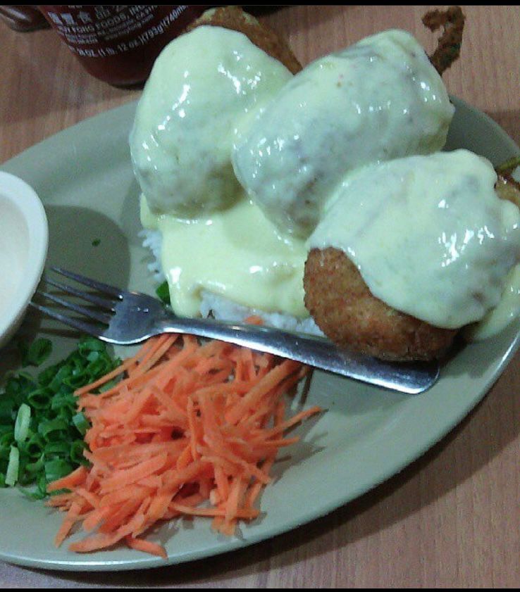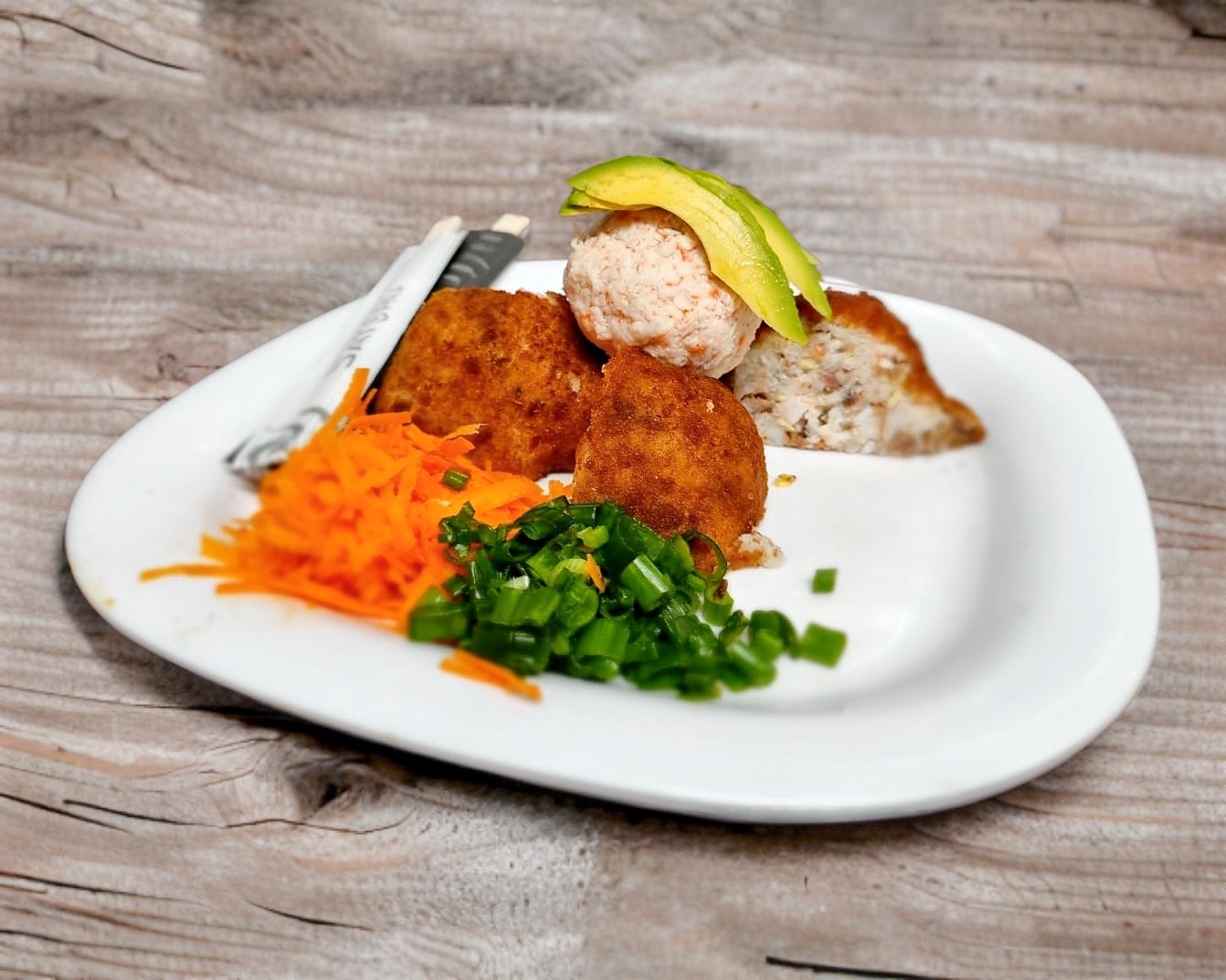 Bola de arroz empanizada revuelta con tocino, camarón, res, Philadelphia y queso chihuahua acompañada con tampico y aguacate a un lado.