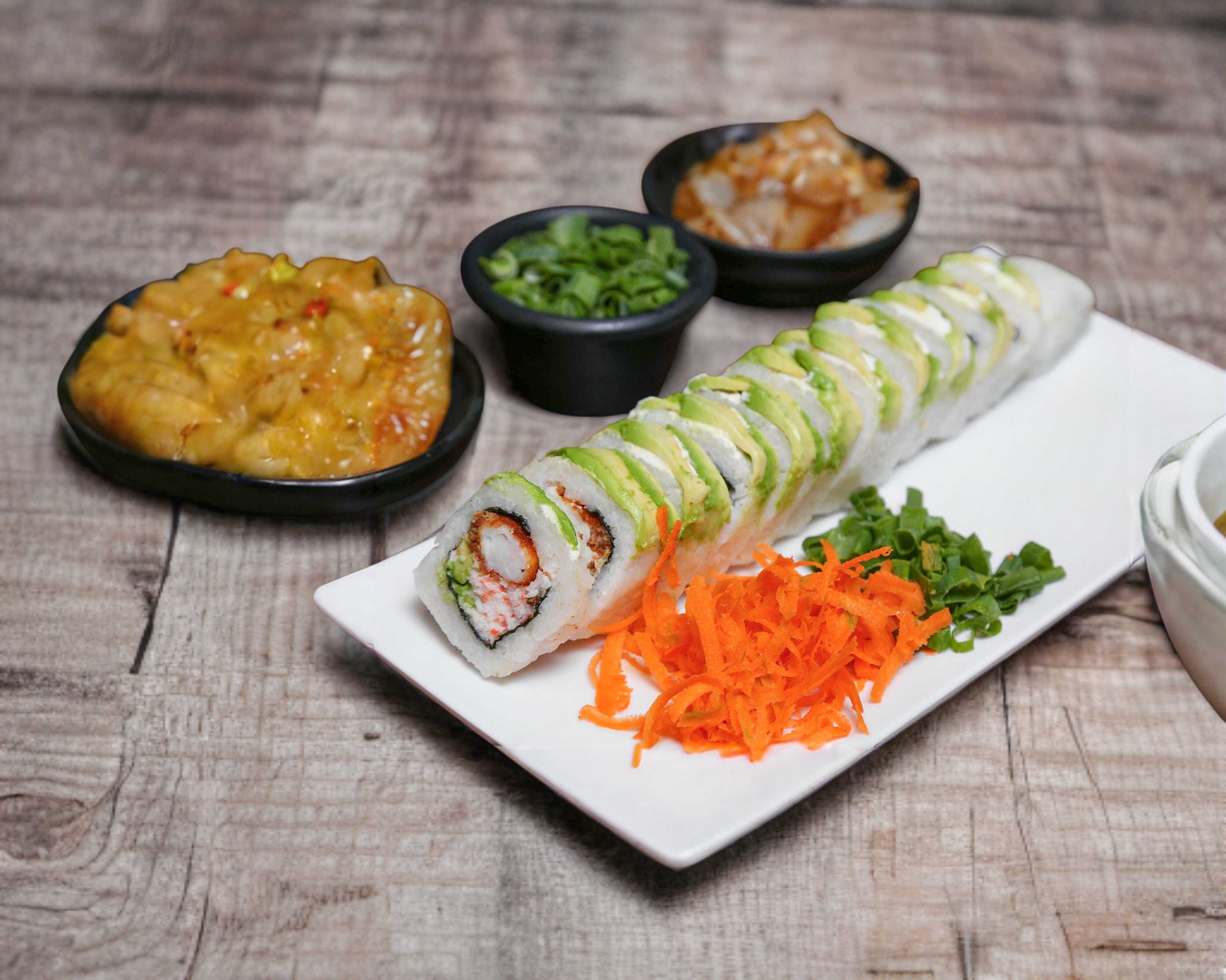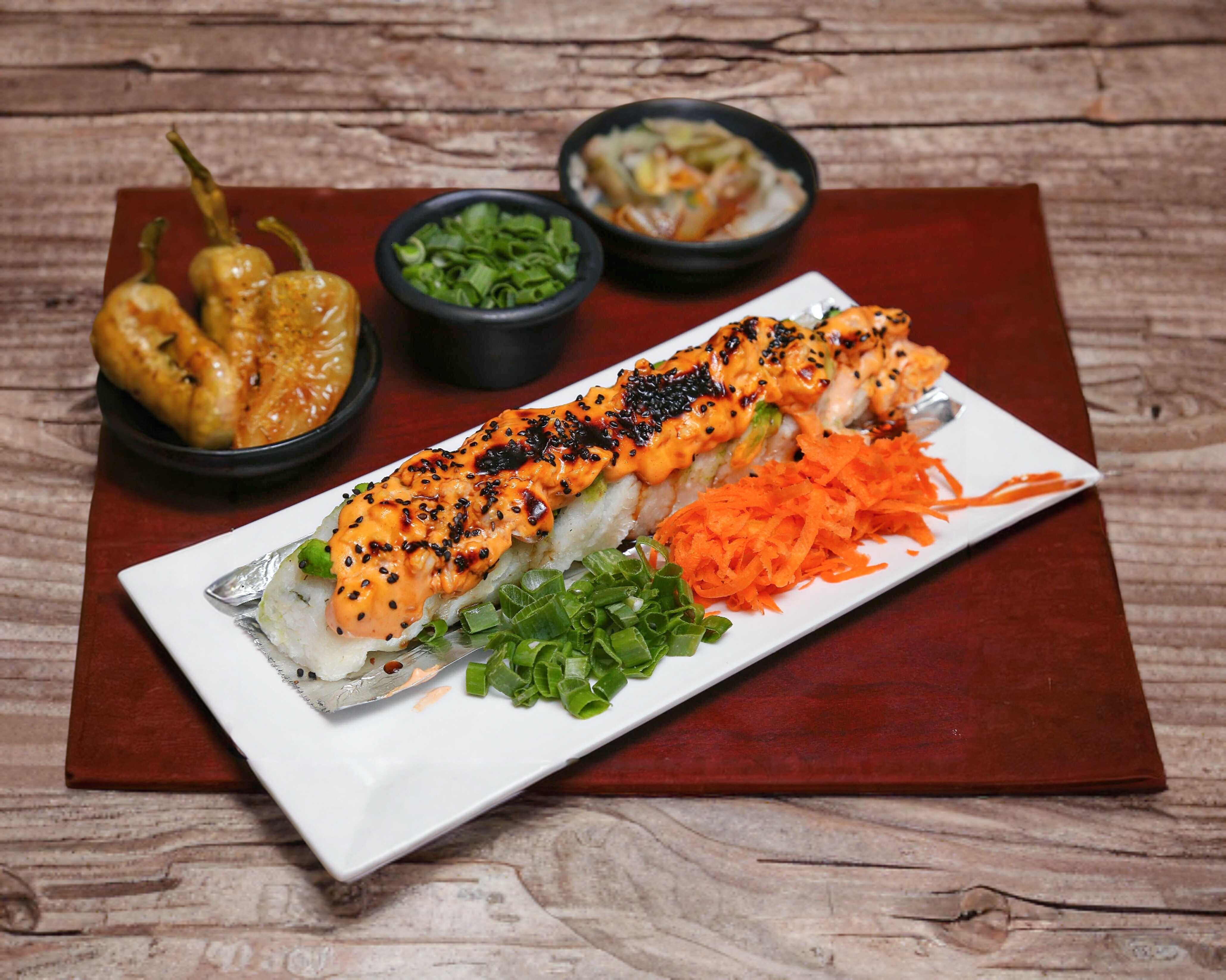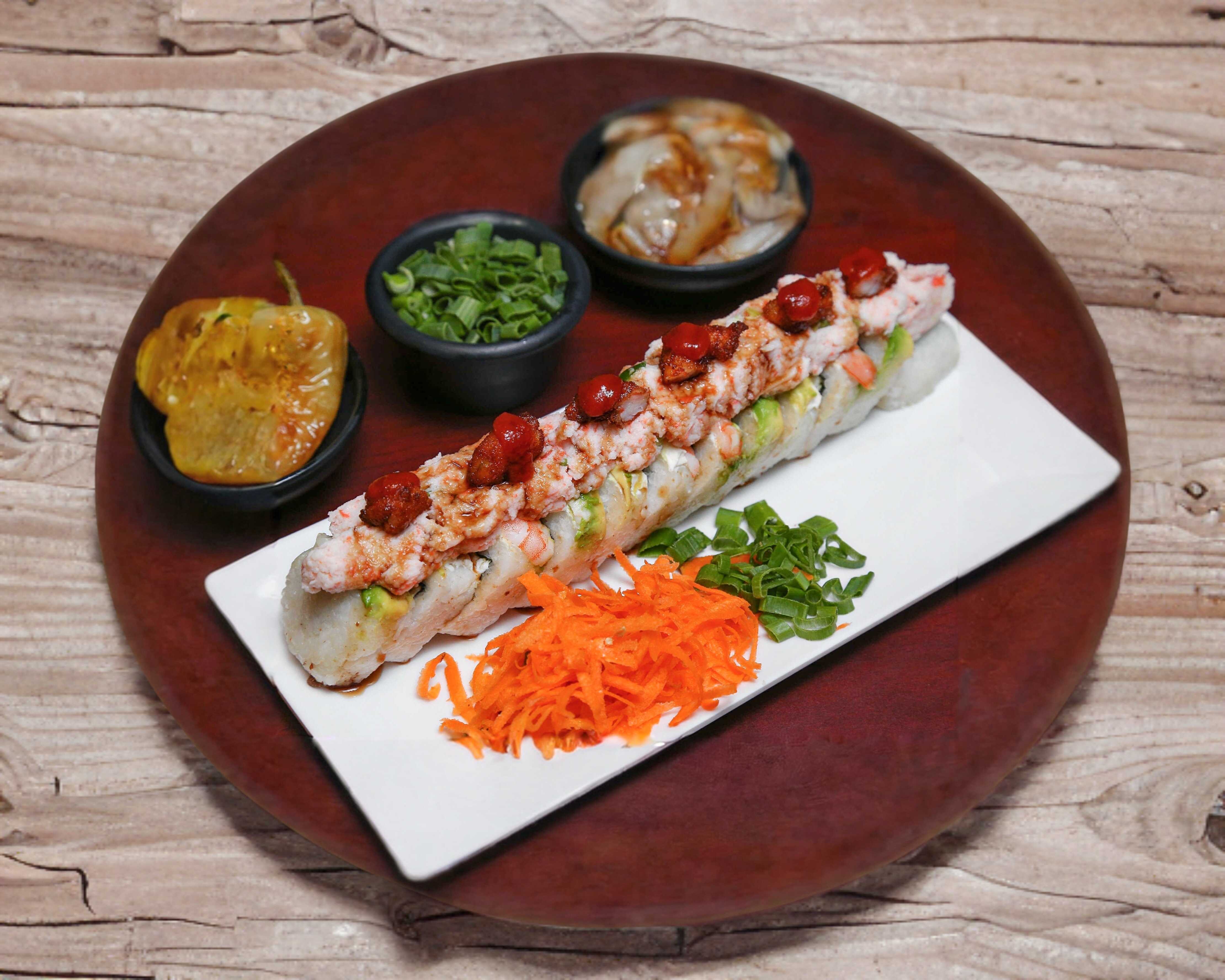 Sushi natural de arroz revuelto con res, pollo, tocino, camarón, Philadelphia, tampico, chile caribe y cebollín, con el gratinado del chacal encima.