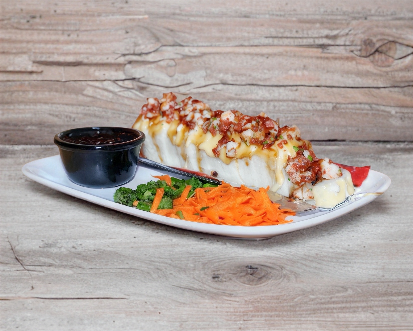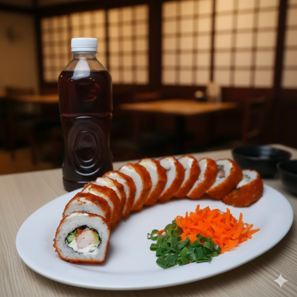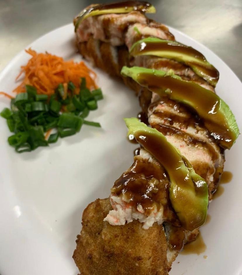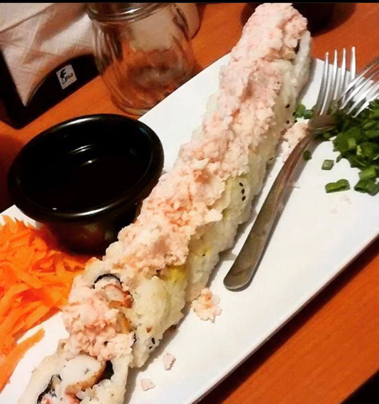 Rollo natural de res empanizada, aguacate, Philadelphia y pepino por dentro; Philadelphia, camarón y aguacate por fuera; con un topping de tampico picoso, trozos de camarón empanizados, salsa roja y salsa de anguila encima.