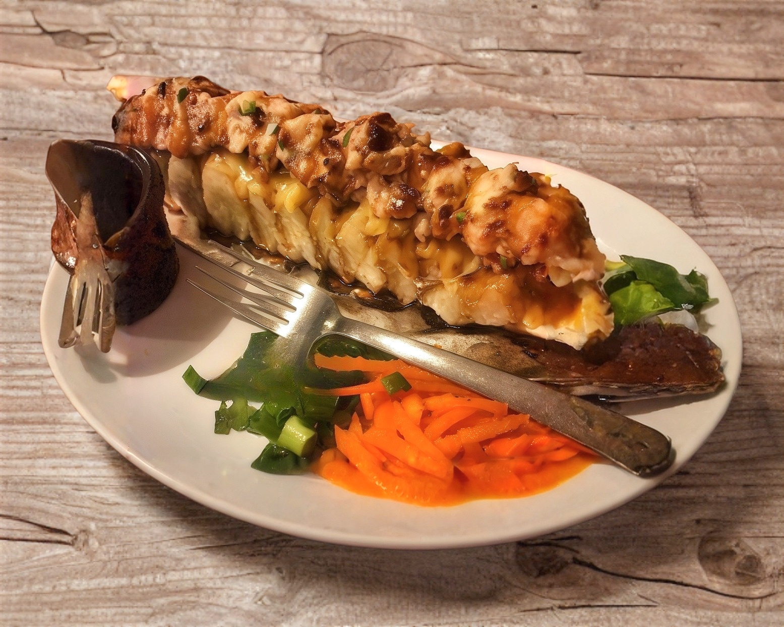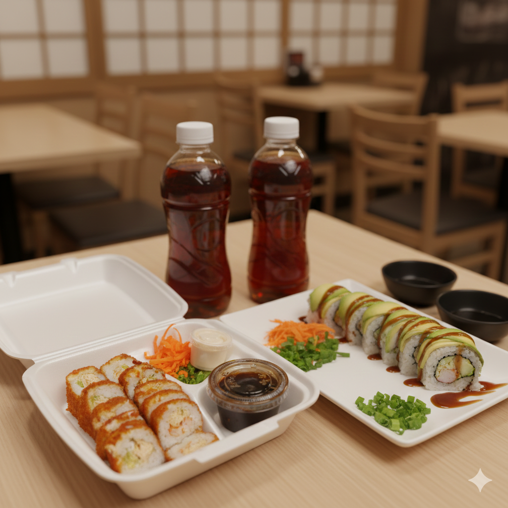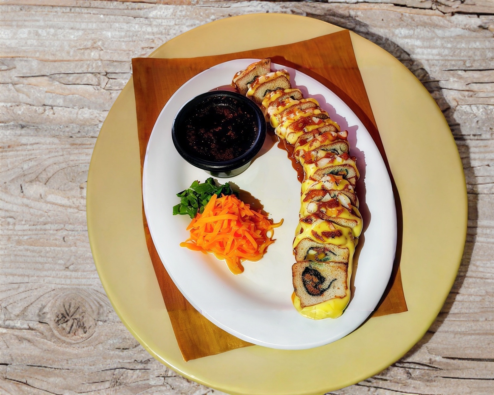 Rollo natural de res empanizada, aguacate, Philadelphia y pepino por dentro; Philadelphia, camarón y aguacate por fuera; con un topping de tampico picoso, trozos de camarón empanizados, salsa roja y salsa de anguila encima.
