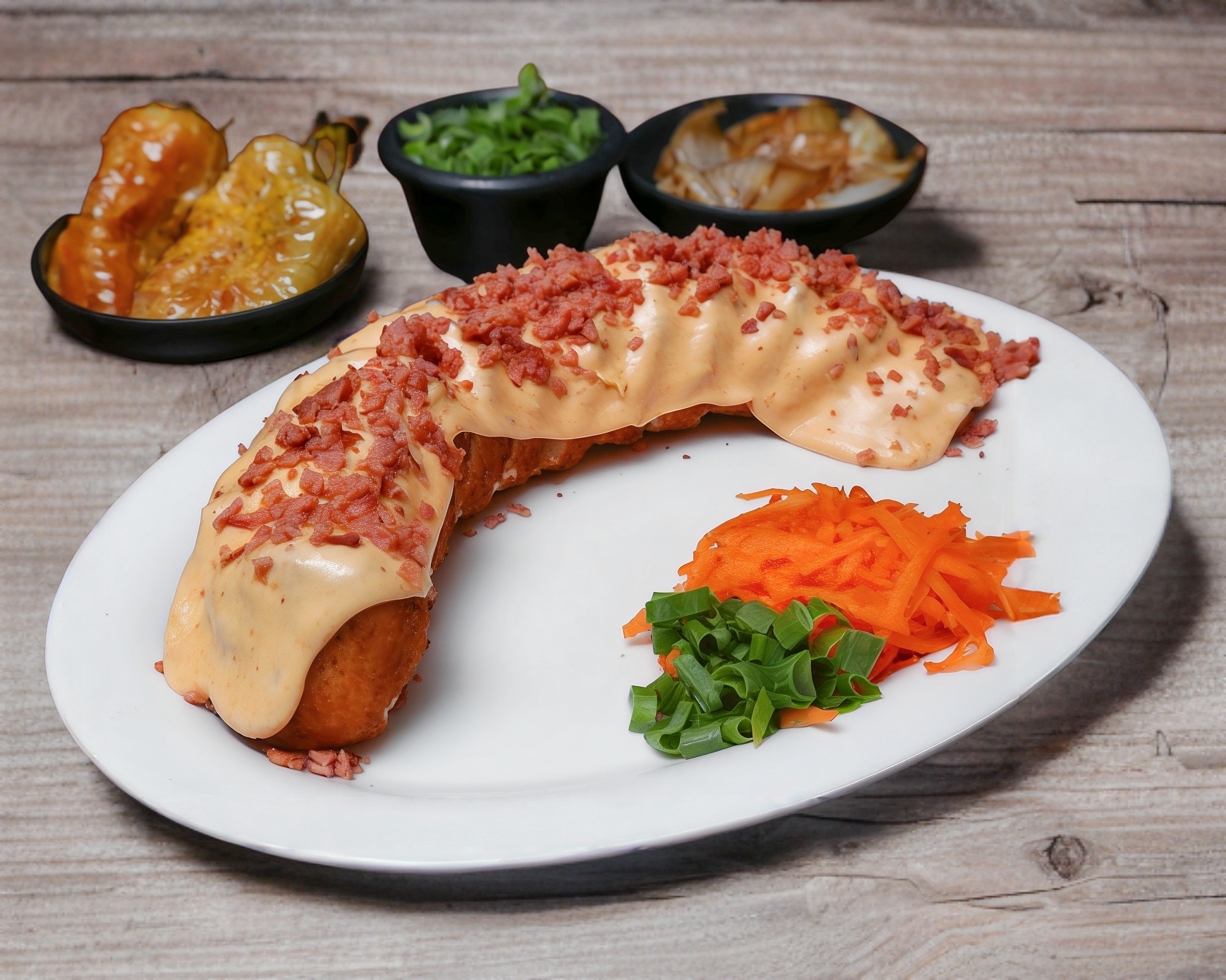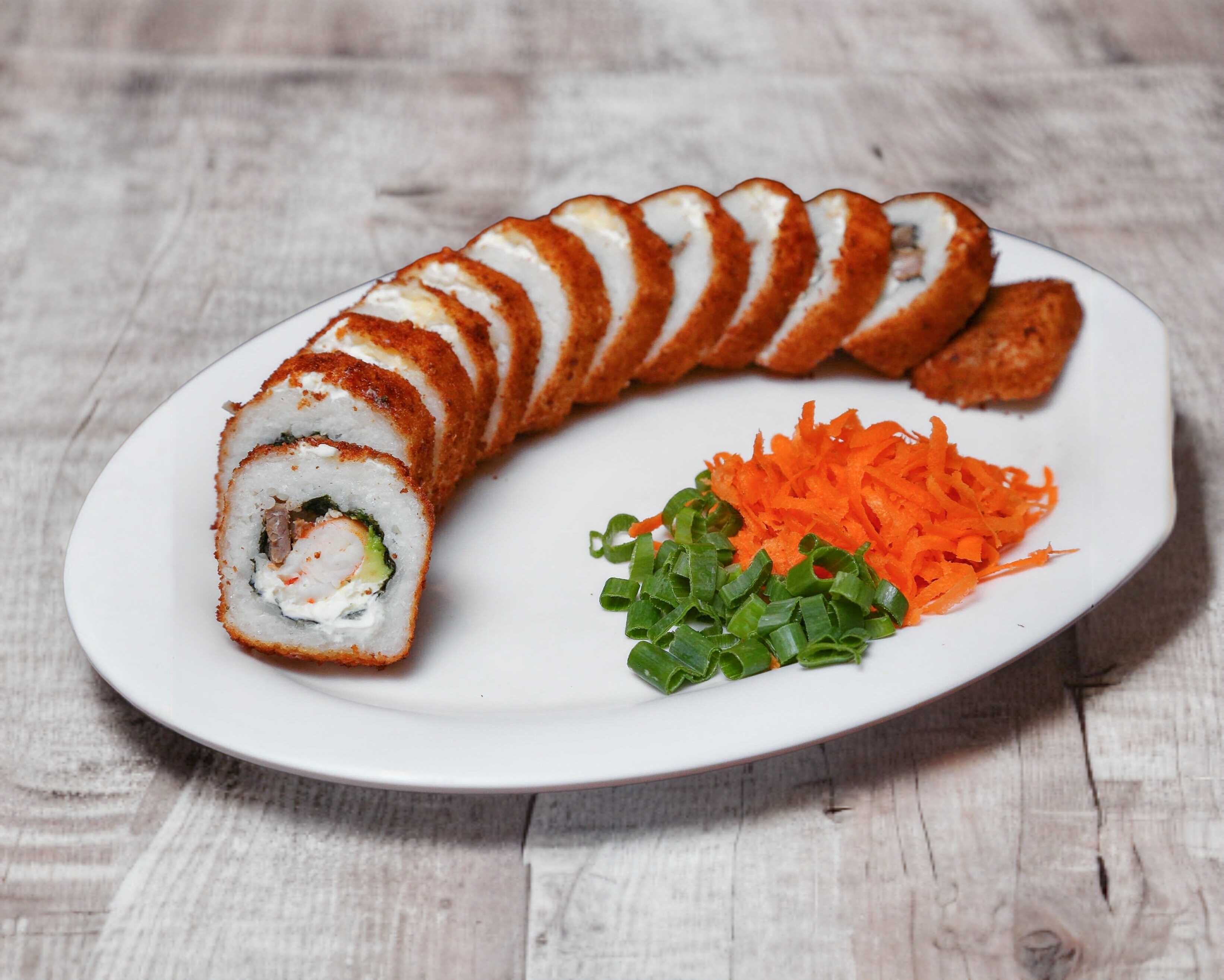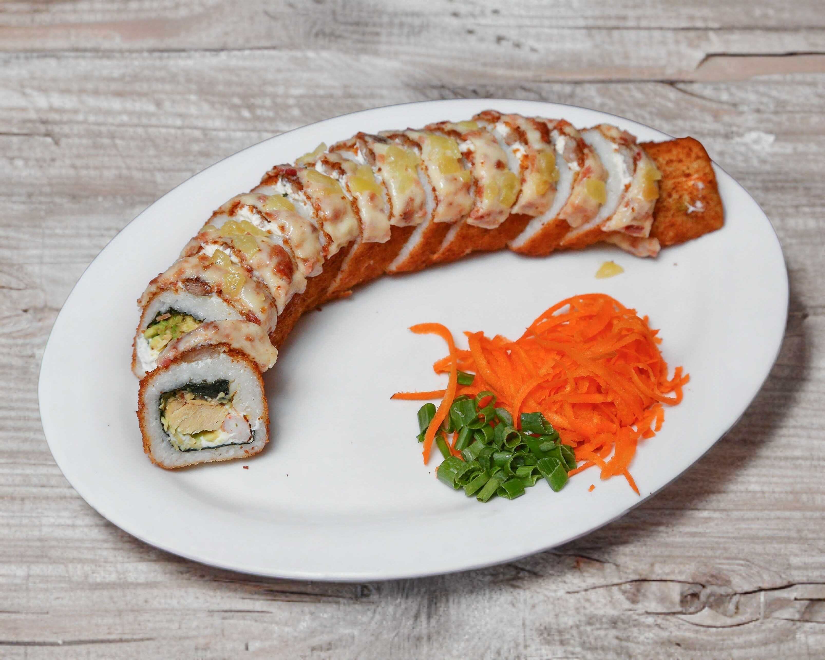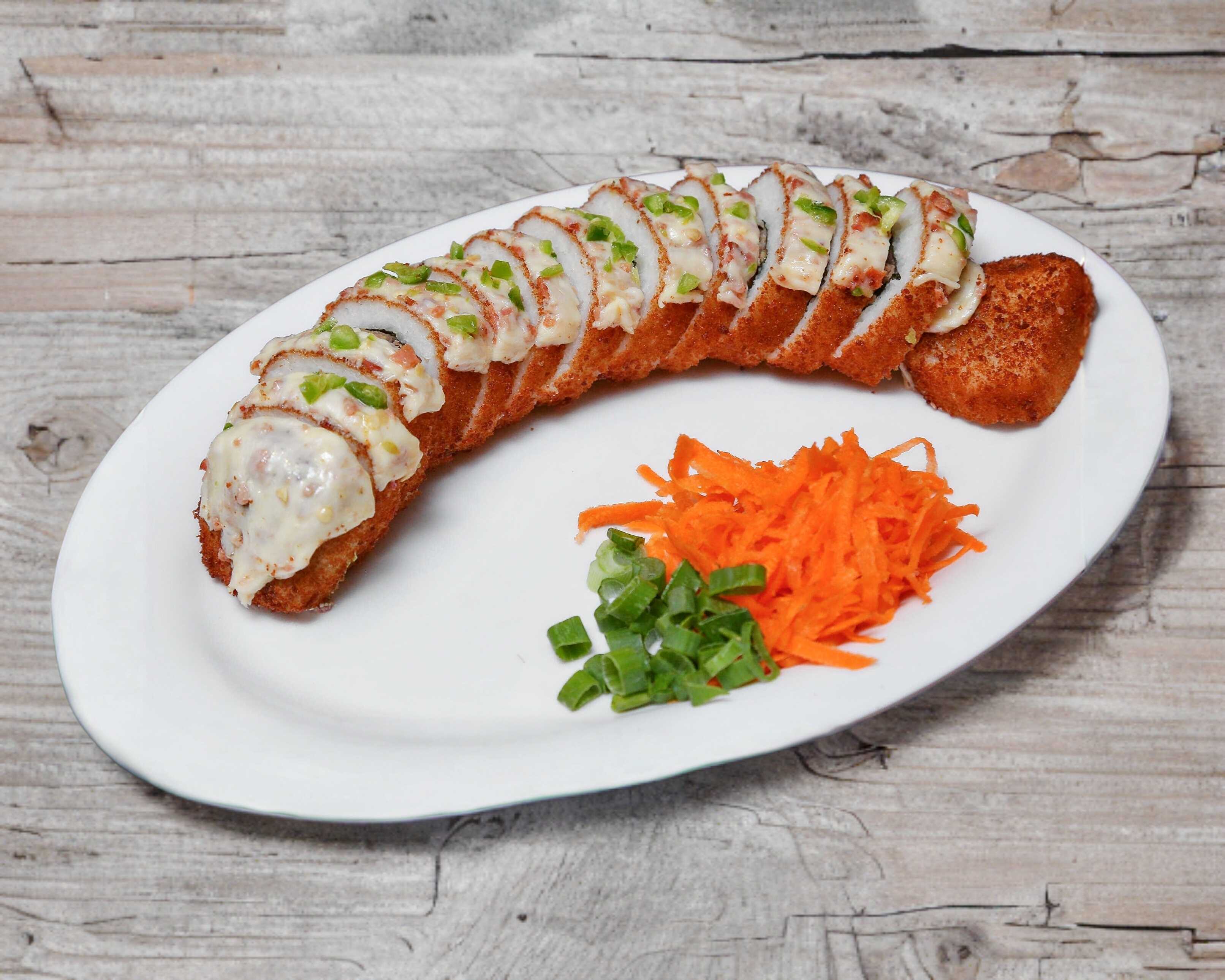 12 piezas de Rollo empanizado, con philadelphia y queso americano por fuera; de camaron, tocino, aguacate, philadelphia por dentro con queso gratinado revuelto con aderezo chipotle y tocino encima.