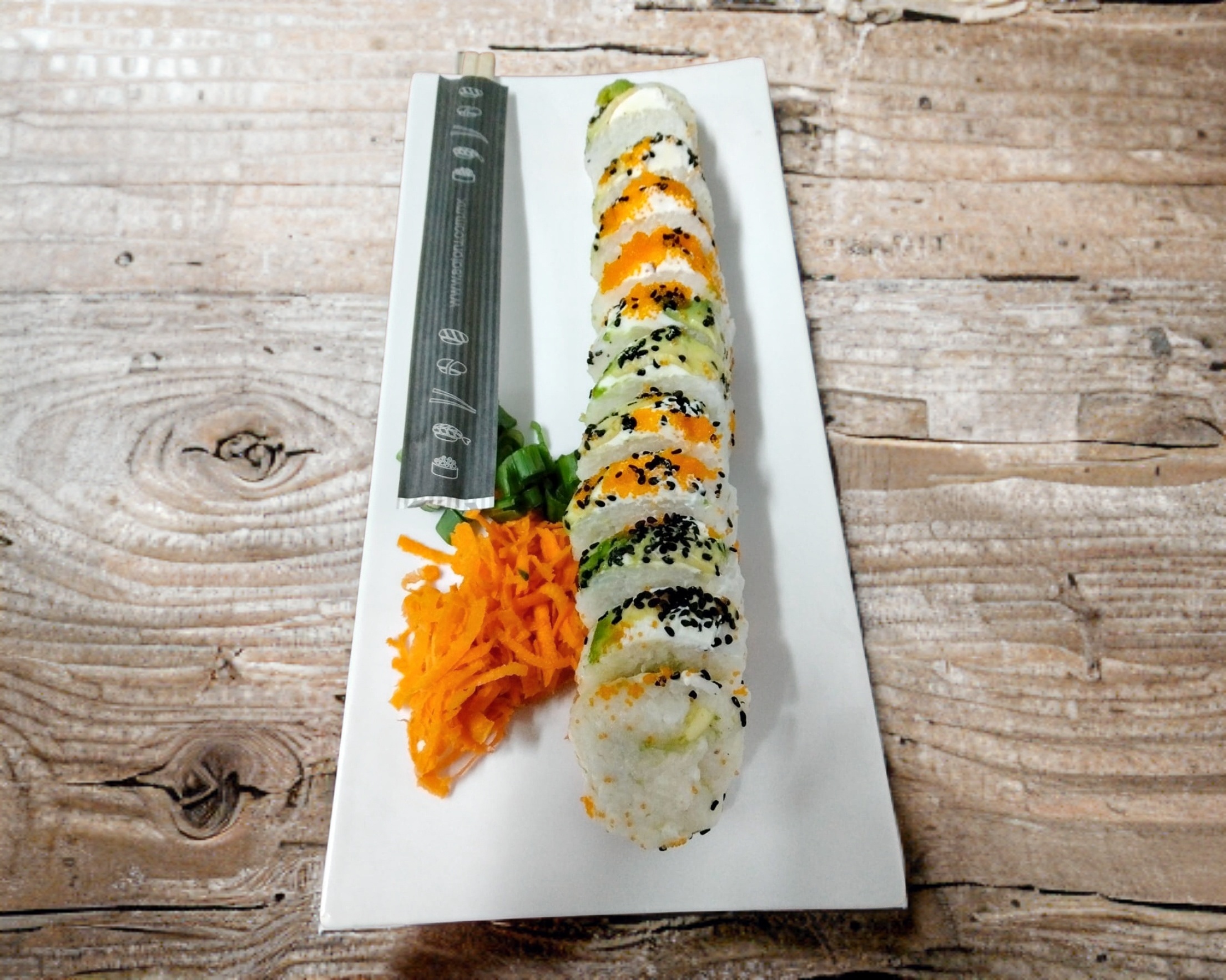 Philadelphia y ajonjoli por fuera; de zanahoria, pepino, aguacate y philadelphia por dentro.