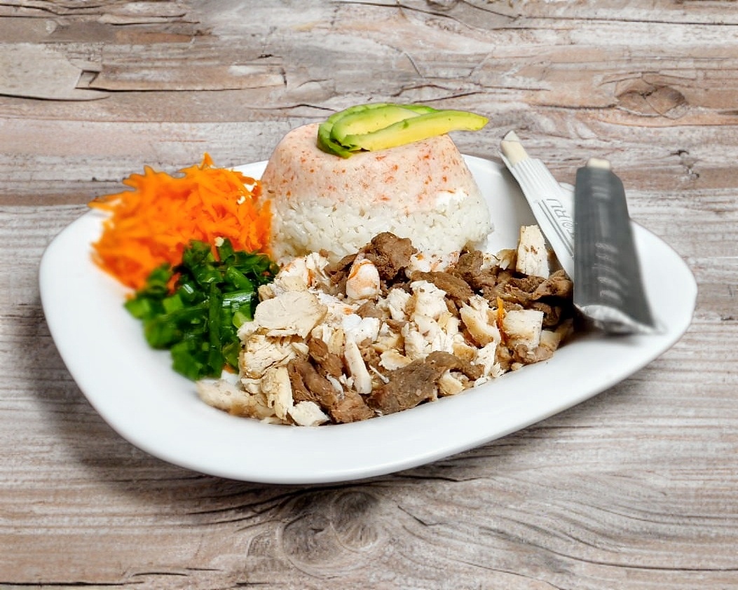 Arroz blanco con tampico, Philadelphia y aguacate, acompañado de trozos de pollo, res y camarón a un lado.