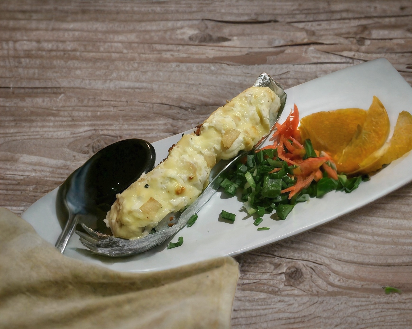 Cangrejo relleno de tampico, philadelphia y camaron.