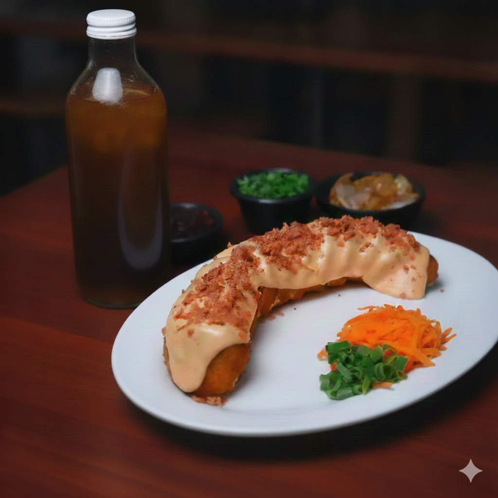 Tocino, aguacate, Philadelphia y pepino por dentro; Philadelphia y aguacate por fuera; con topping de pollo empanizado, cebolla asada, cebollín y chile caribe; salsa de anguila encima.