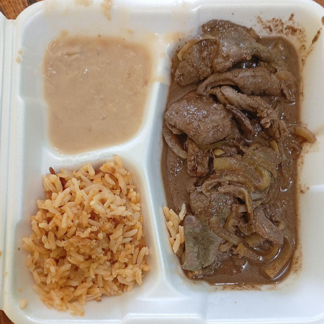 Huevos con bistec ranchero en salsa casera de jitomate y especias.