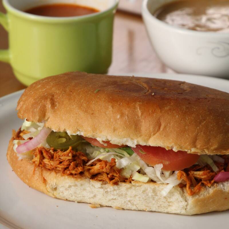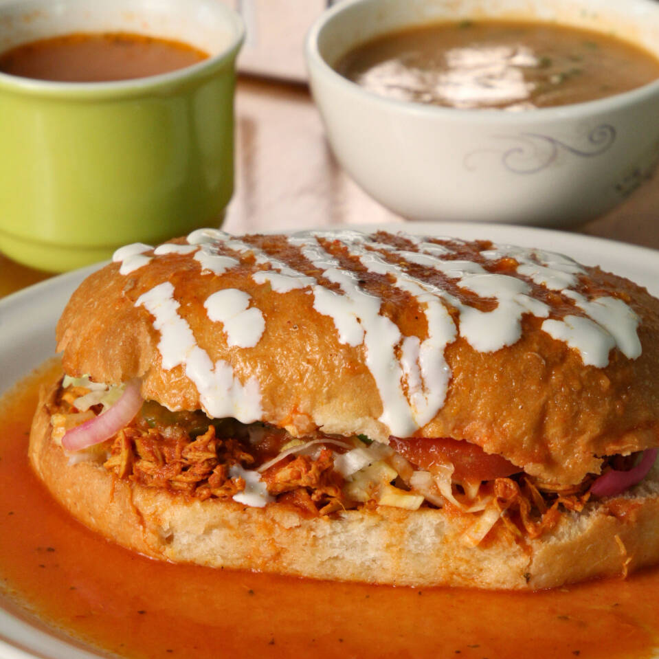 Con lechuga, zanahoria, pepino, cebolla curtida, queso, crema y aguacate, con su consomé.