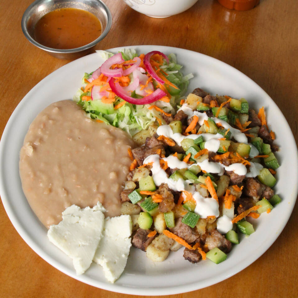 Cubitos de carne de res, papa frita y calabaza, acompañado con frijoles, lechuga, zanahoria, pepino, cebolla curtida, queso, crema y aguacate, con su consomé.