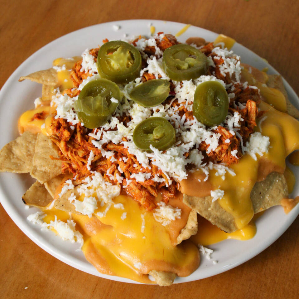Nachos con frijol, queso para nachos, cochinita, queso rallado y chiles jalapeños.