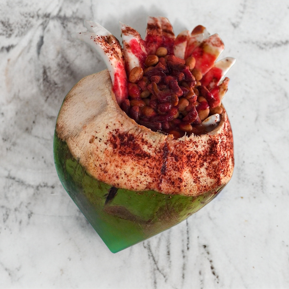 Coco con tostitos, pepino, camaron cocido, cacahuate, rielito, picante y agua de coco