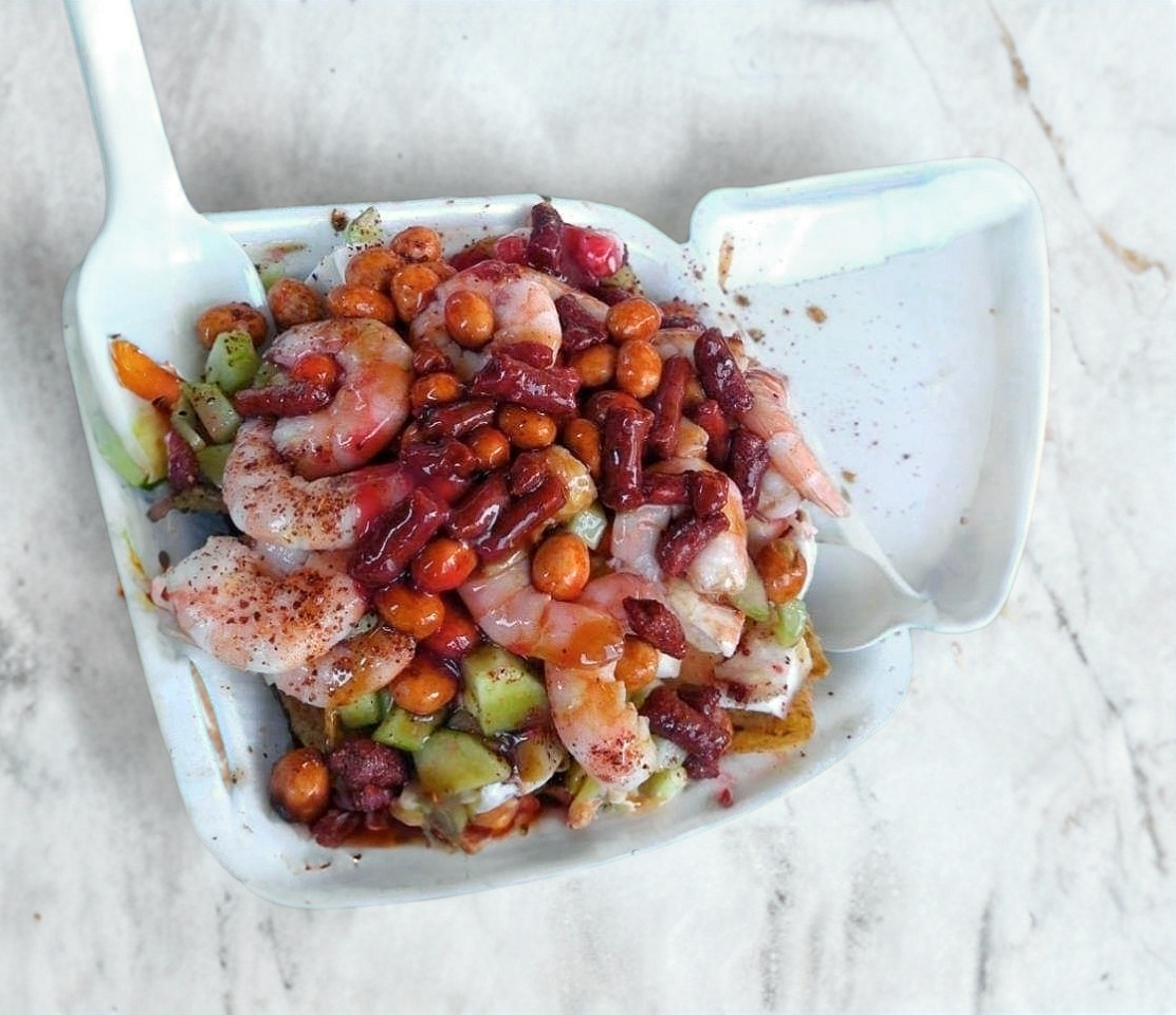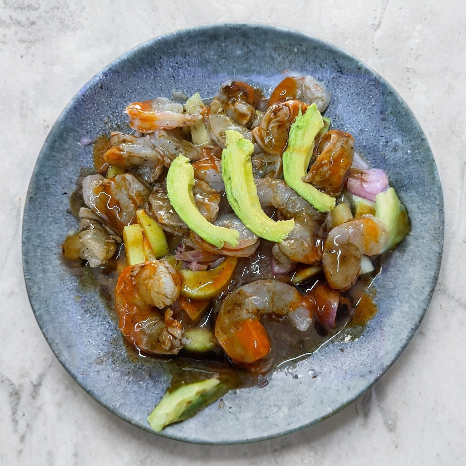 camarón aguachile, pepino, cebolla, salsas, con un toque de jugo de camarón preparado