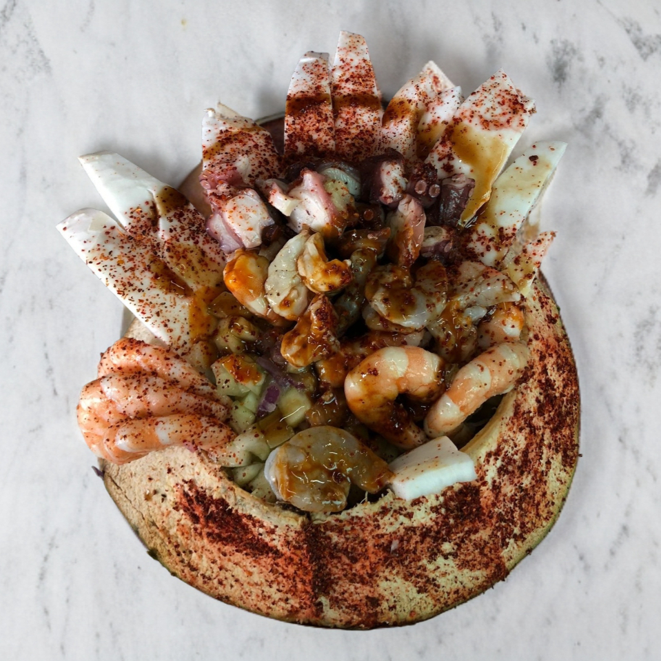 Coco con camaron cocido, aguachile, pulpo, callo, pepino, cebolla, picante, tostadas y agua de coco