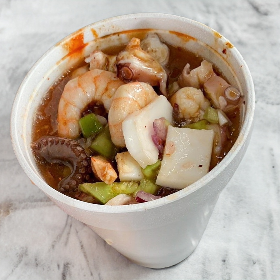 ngredientes coco,camarón cocido, aguachile,pulpo,callo, pepino ,cebolla