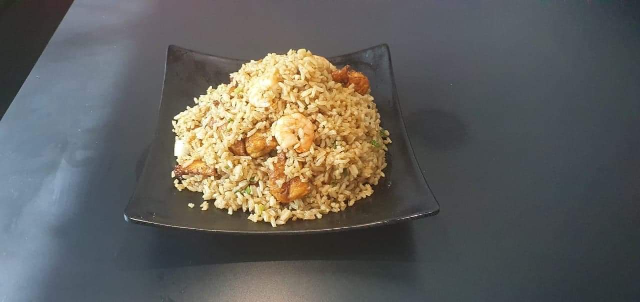 Arroz frito con puerco, camarón y huevo.
