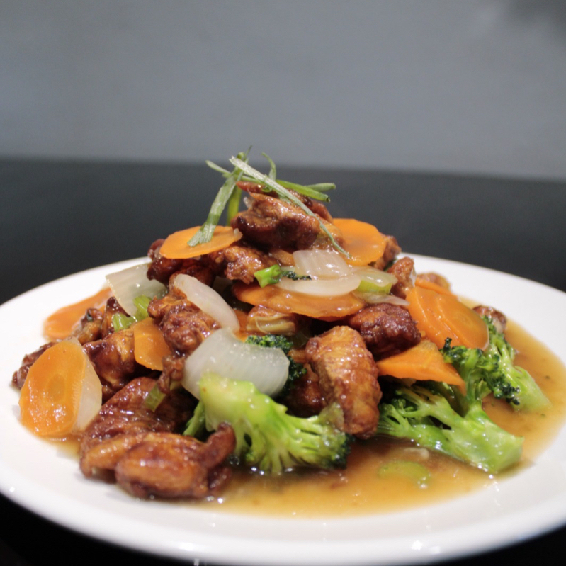 Jugosos trozos de pollo salteados con brócoli, zanahoria, apio y cebolla . Decorado con cebollita cambray. Acompañado con arroz frito