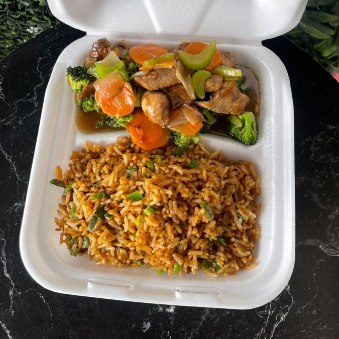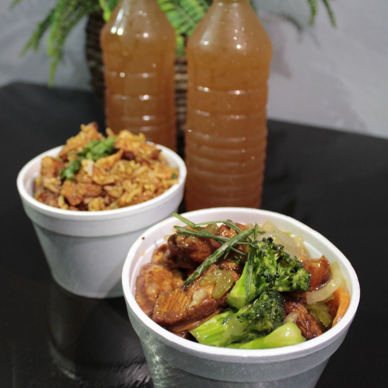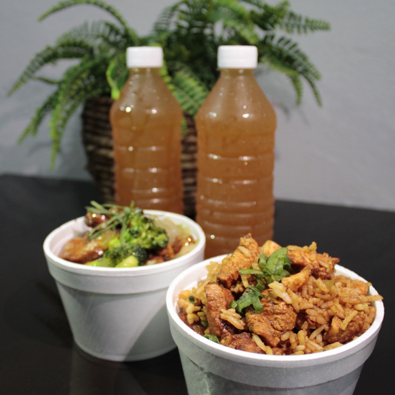 Jugosos trozos de pollo salteados con brócoli, zanahoria, apio y cebolla. Platillo 1/2 litro, acompañado con arroz frito y 1/2 litro de té.