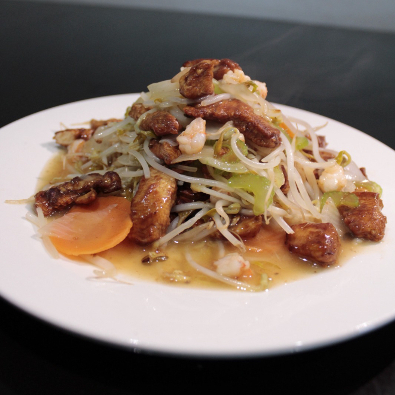 Salteado ligero y saludable. Pollo y camarón con base de brotes (chopsuey), cebolla, apio y zanahoria sazonado con sal. Acompañado con arroz frito