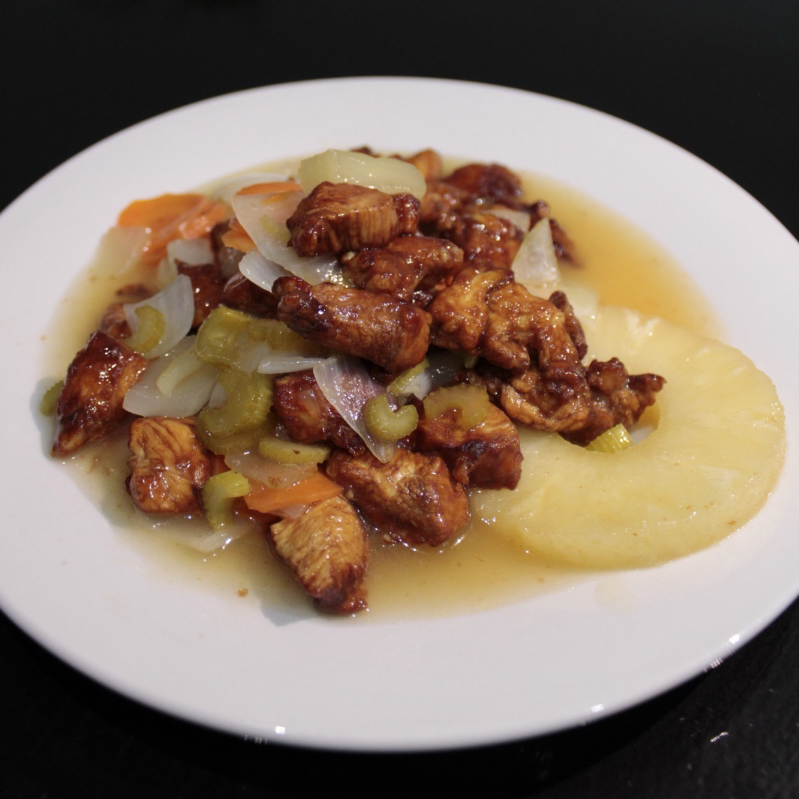 Explosión tropical de sabor agridulce, pollo, cebolla, piña,apio y zanahoria 1/2 litro. Acompañado con arroz frito