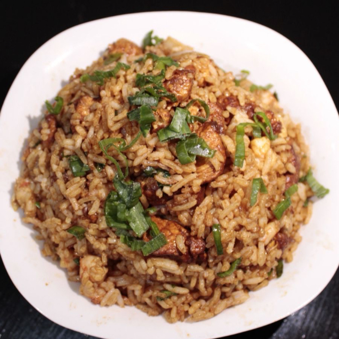 Clásico arroz salteado con pollo y cebollita cambray.