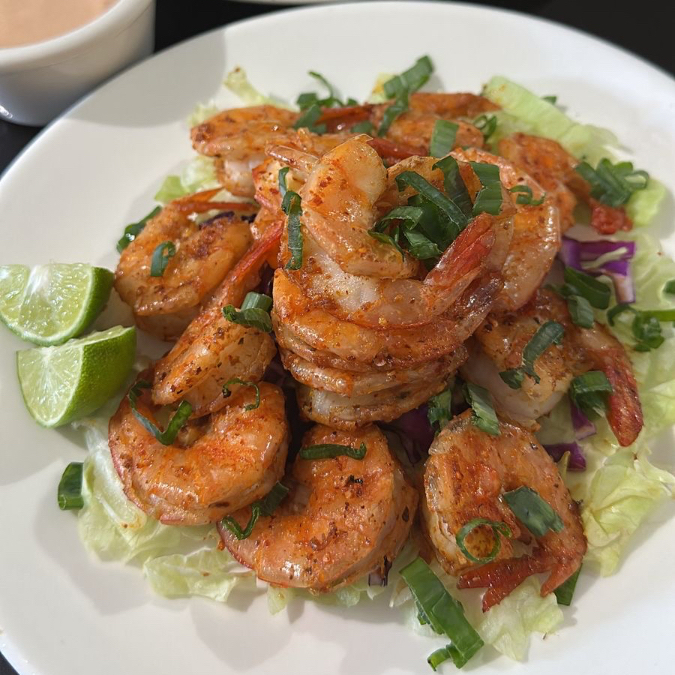 Camarones con cáscara salteados con cebolla y cebollita cambray, sazonados con sal y toque picante de chile chilpitin, acompañados con nuestra salsa secreta de la casa.