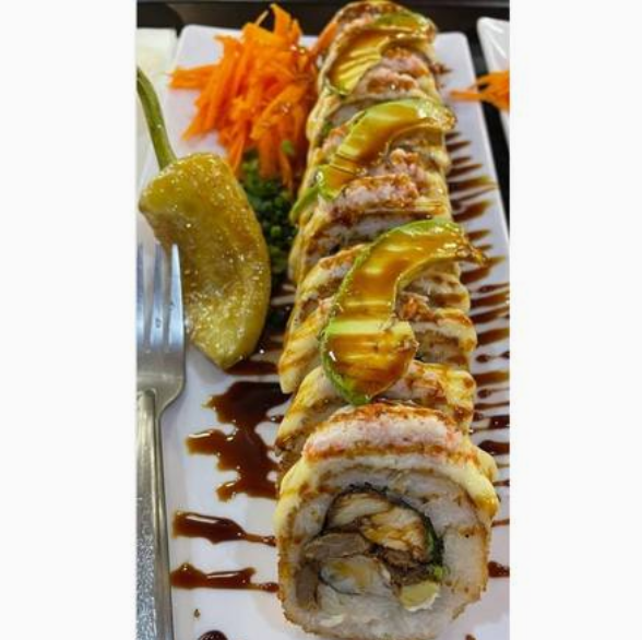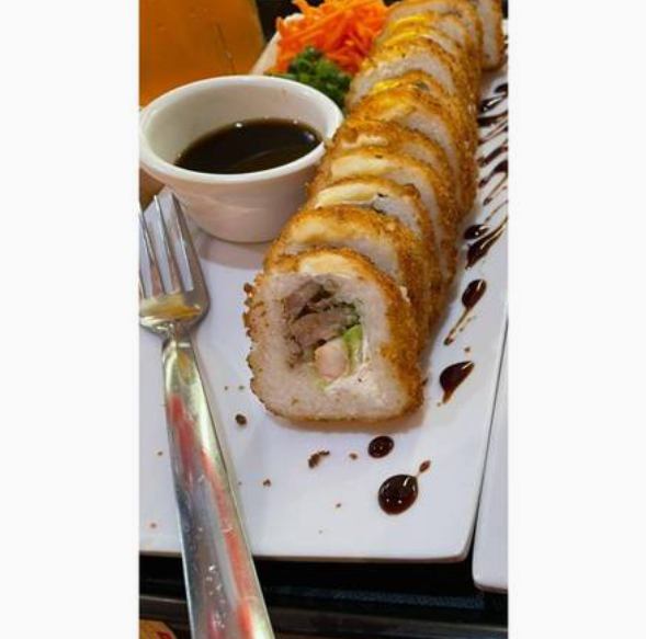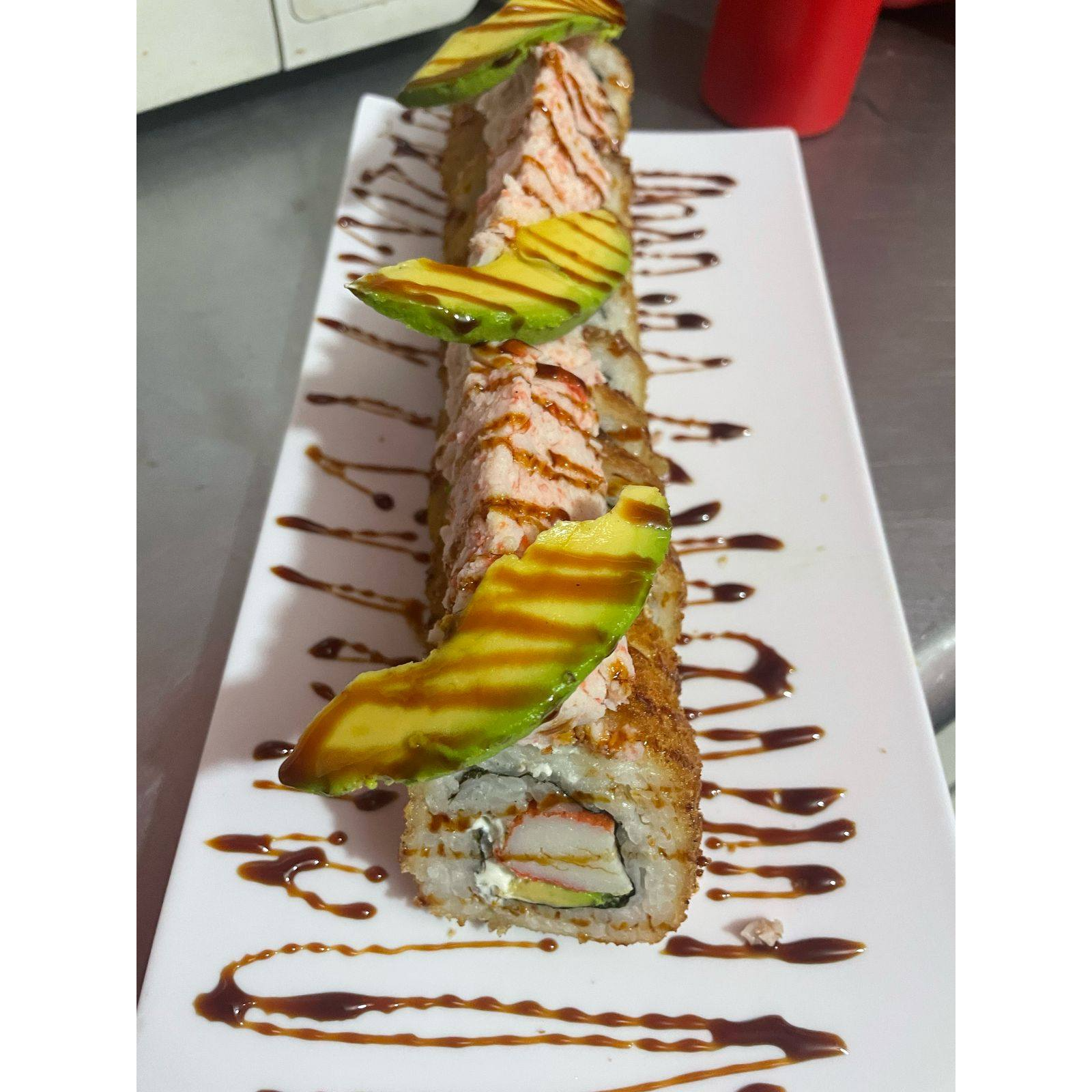 Adentro camarón empanizado, fila y aguacate, afuera un spicy de tocino horneado
