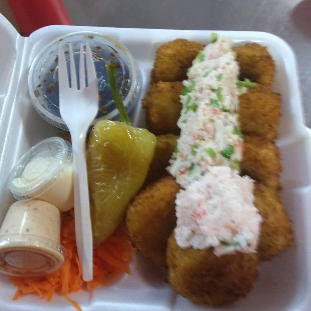 pollo, res, fila, aguacate con fritura de surimi (empanziado)