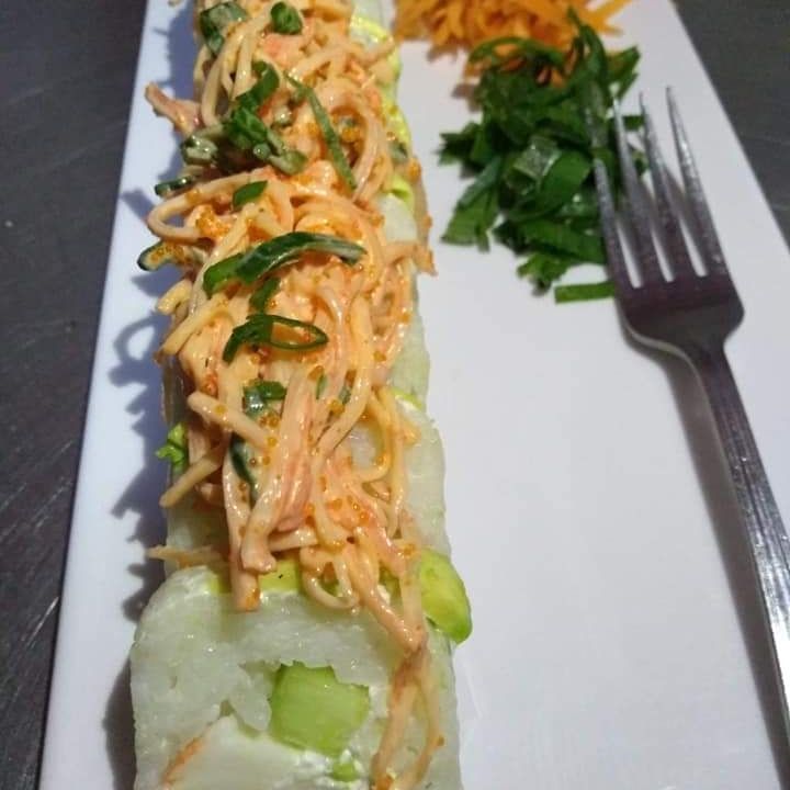 camarón, surimi, fila, aguacate y pepino forrado de aguacate con ensalada konicana (natural)
