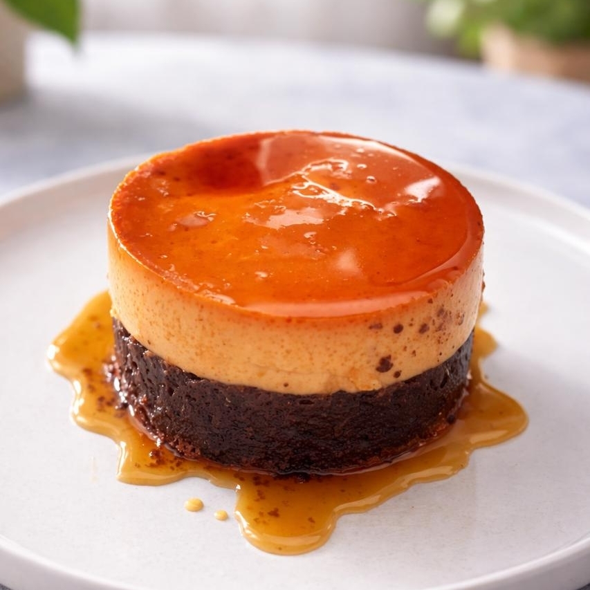 Flan casero con pastel de chocolate