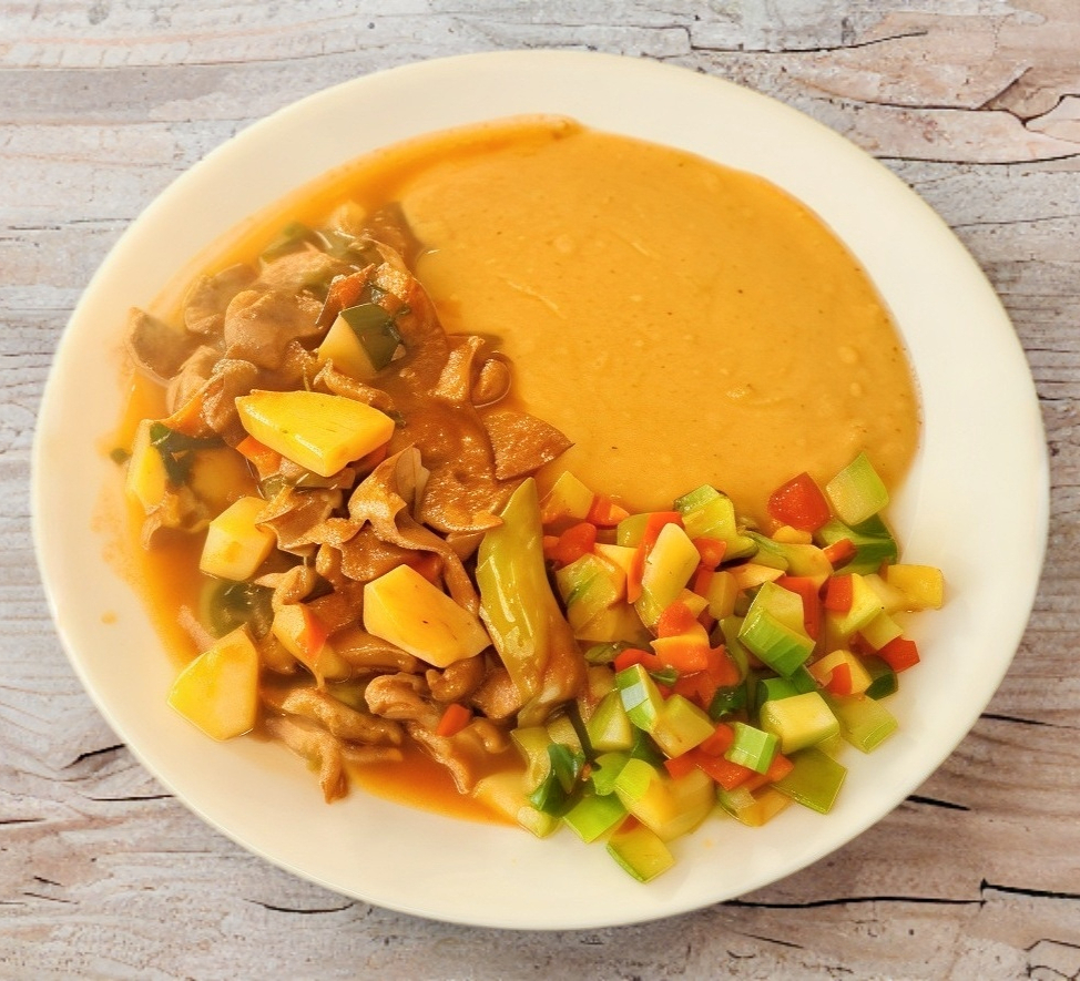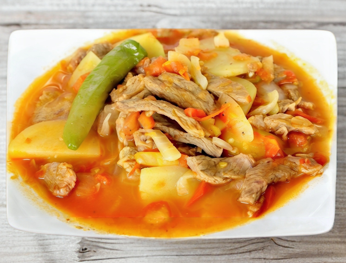 Barbacoa de res papa y zanahoria acompañada de dos guarniciones.