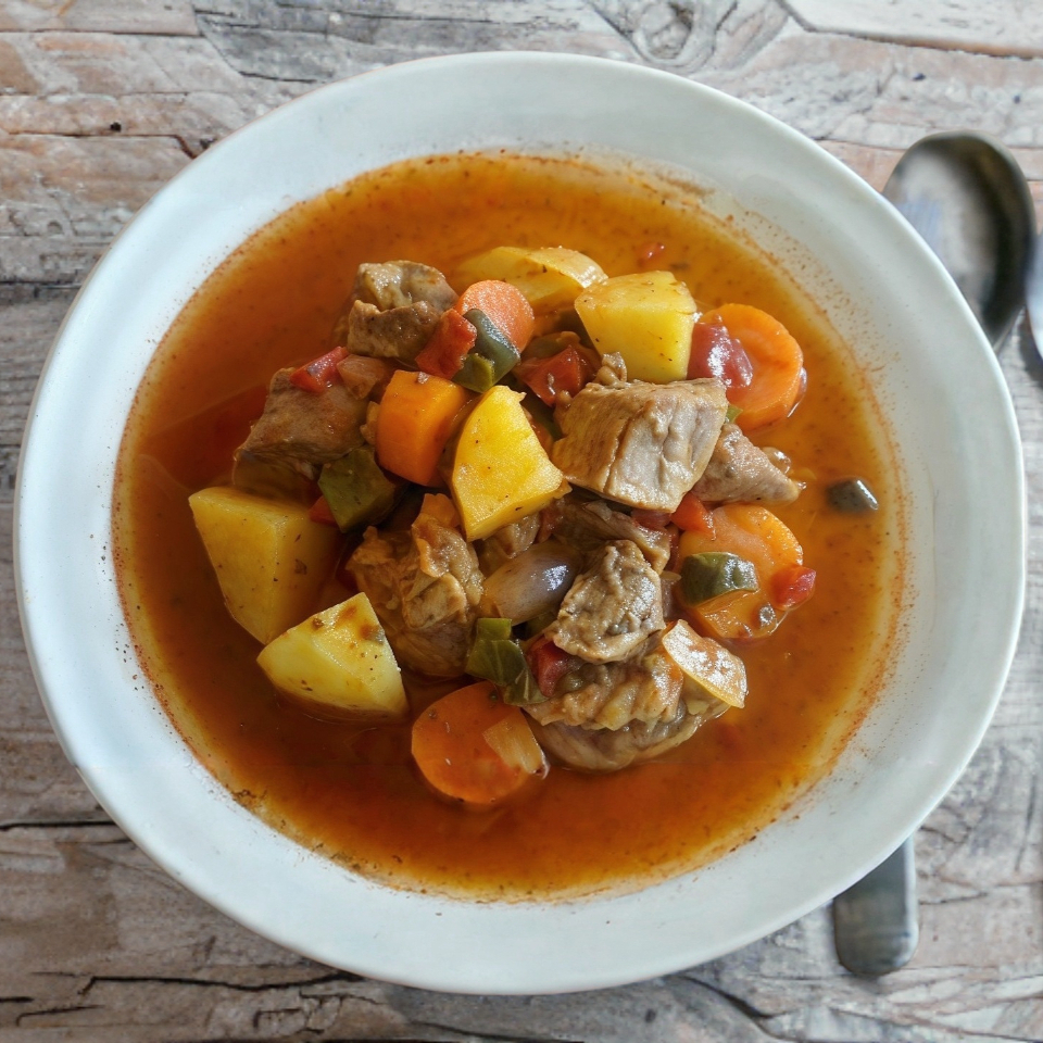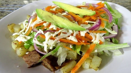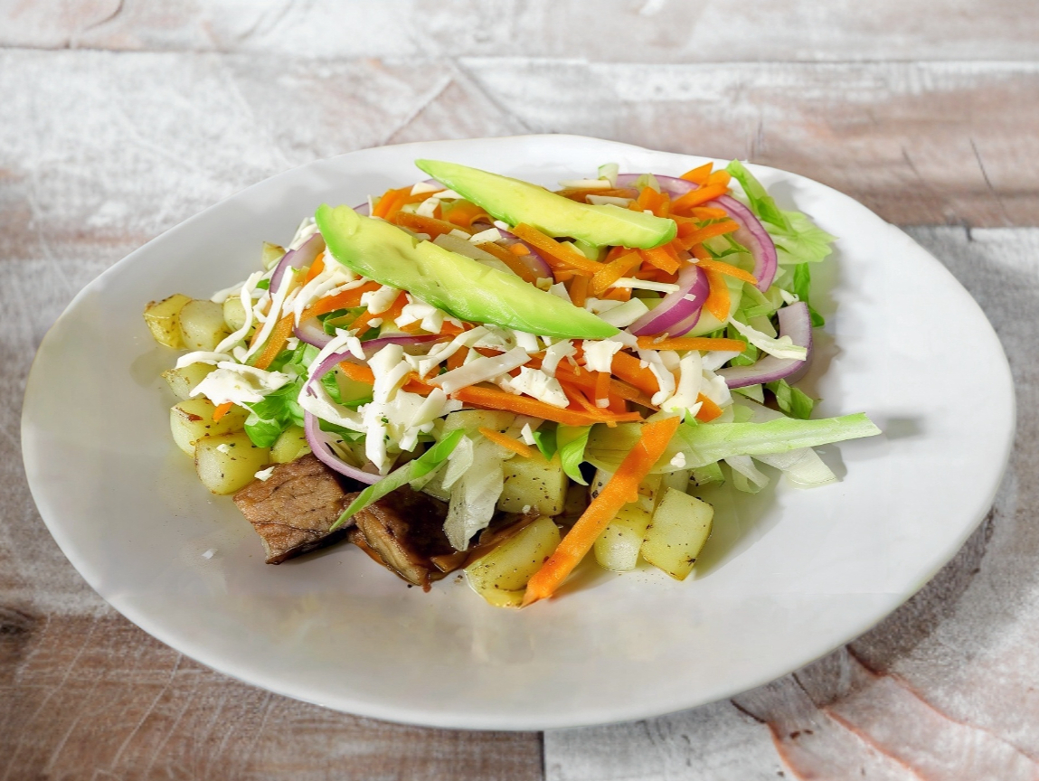 De res con papa, verdura fresca, acompañado de salsa y frijol.