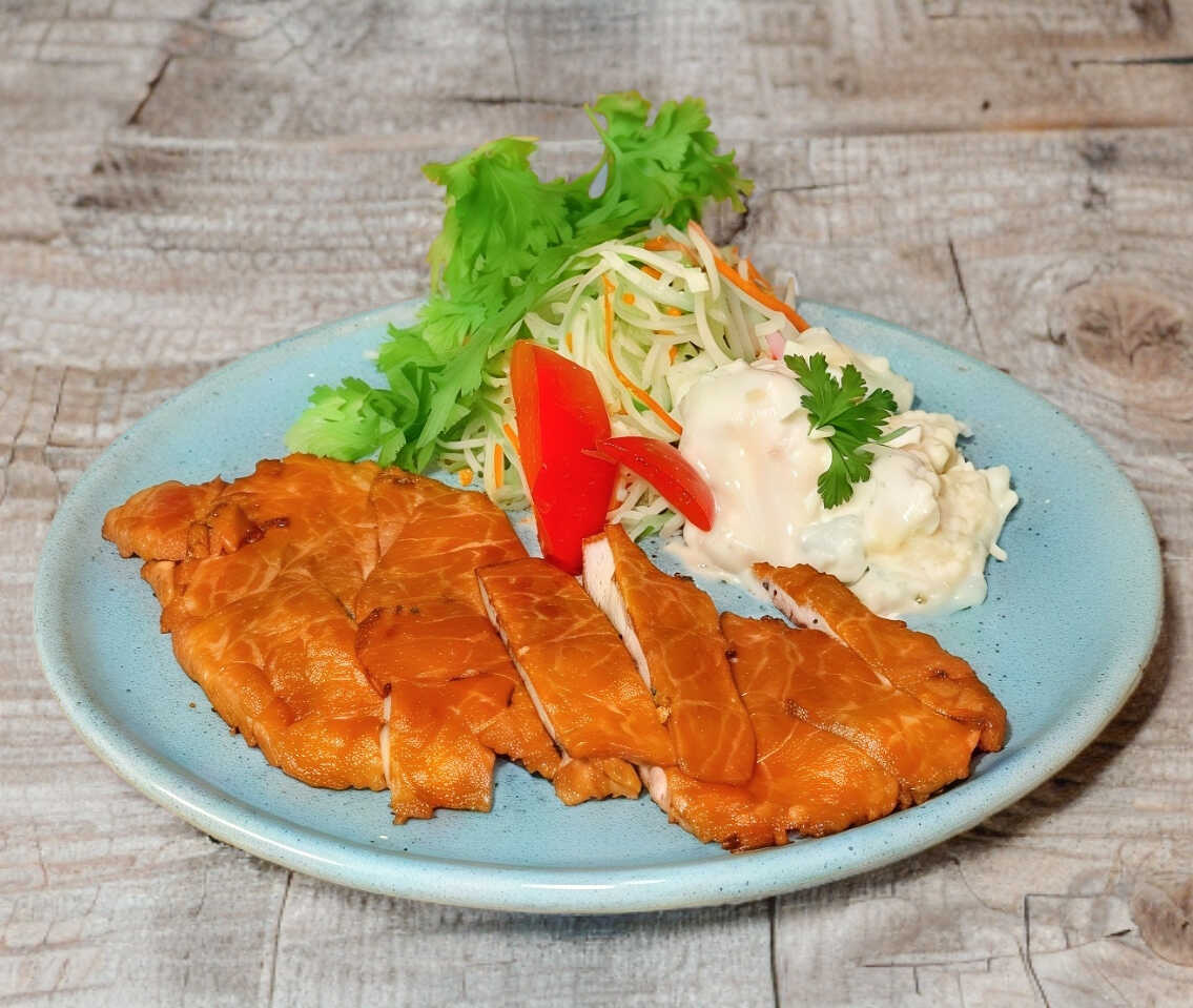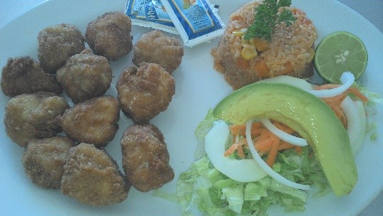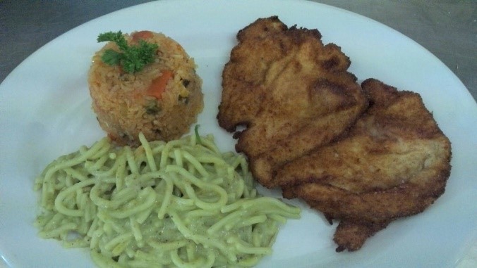 Jugosa Pechuga Empanizada de 120g aprox que se Acompaña de 2 guarniciones que elijas,