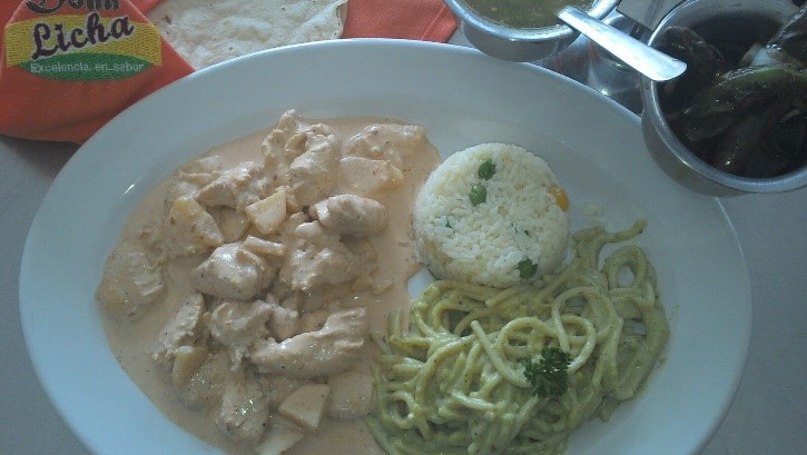Pechuga de pollo en crema chipotle y papa, acompañado de dos guarniciones.