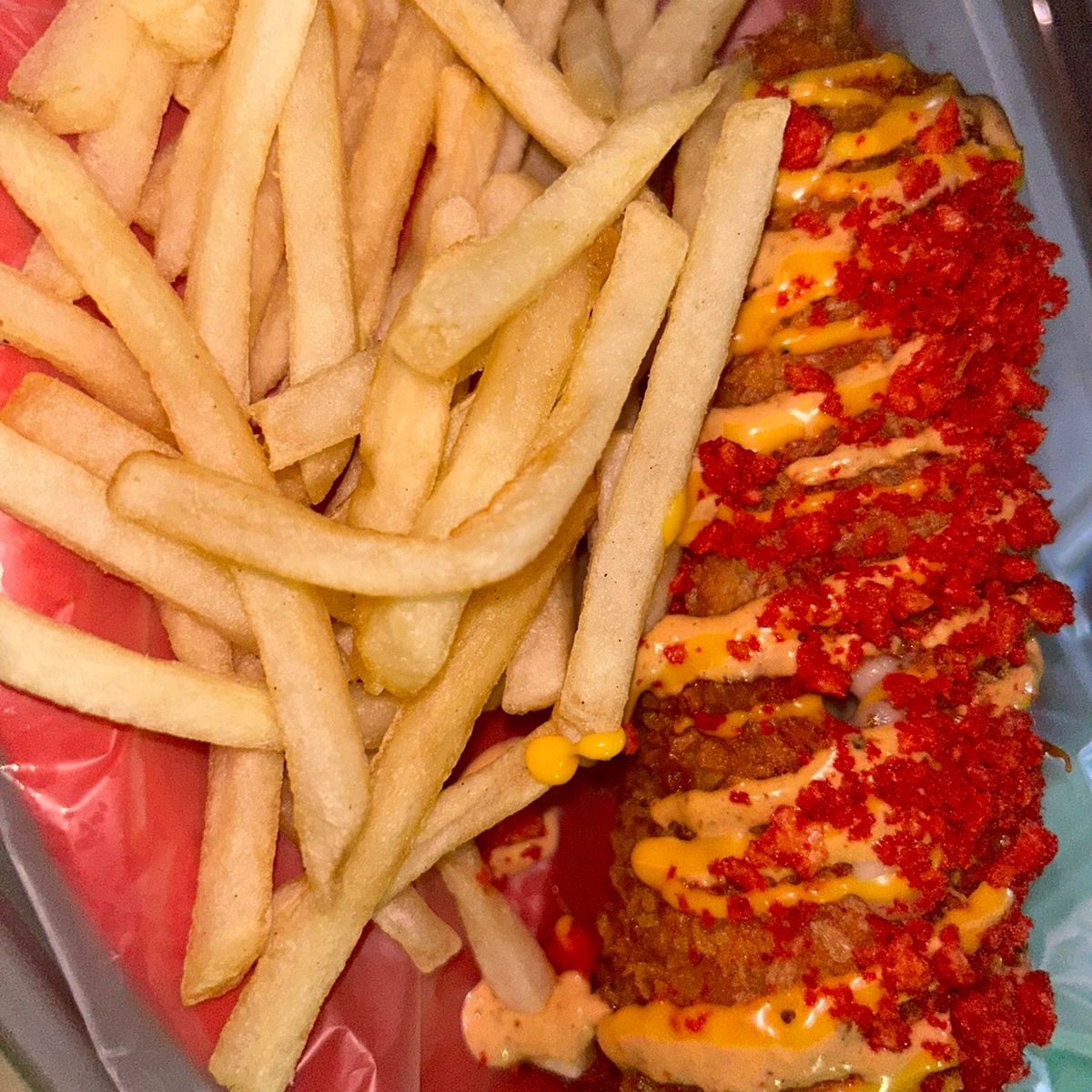 Banderilla con salchicha clásica, roja, y queso mozzarela, cubierta de crujiente panko, acompañada de papas fritas