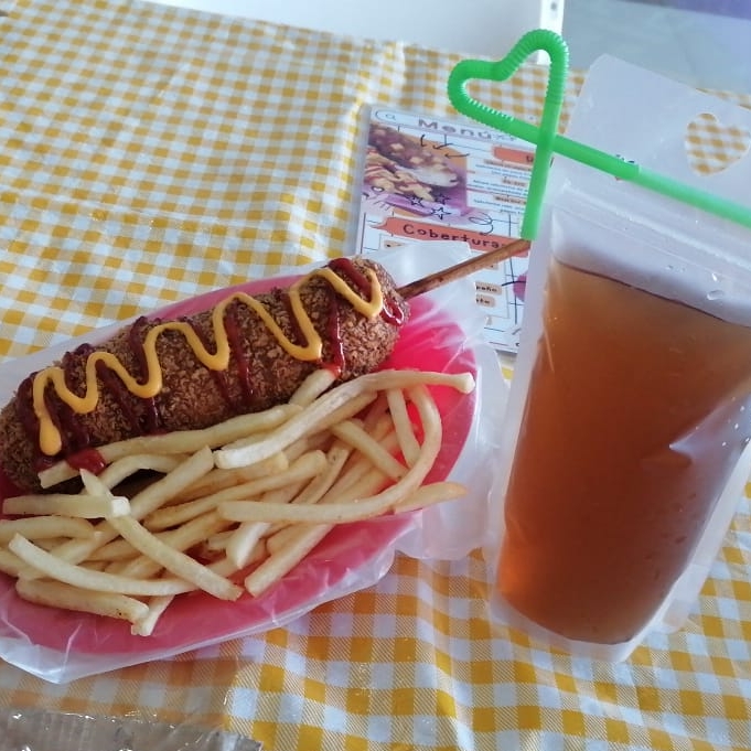 banderilla mitad salchicha de pavo y mitad queso mozzarella, cubierta de crujiente panko aompañada de papas francesas