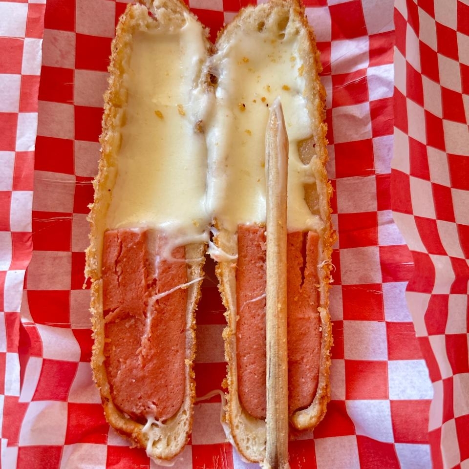 Banderilla mitad salchicha roja frita, mitad queso mozzarella, cubierta de crujiente panko, acompañada de papas fritas