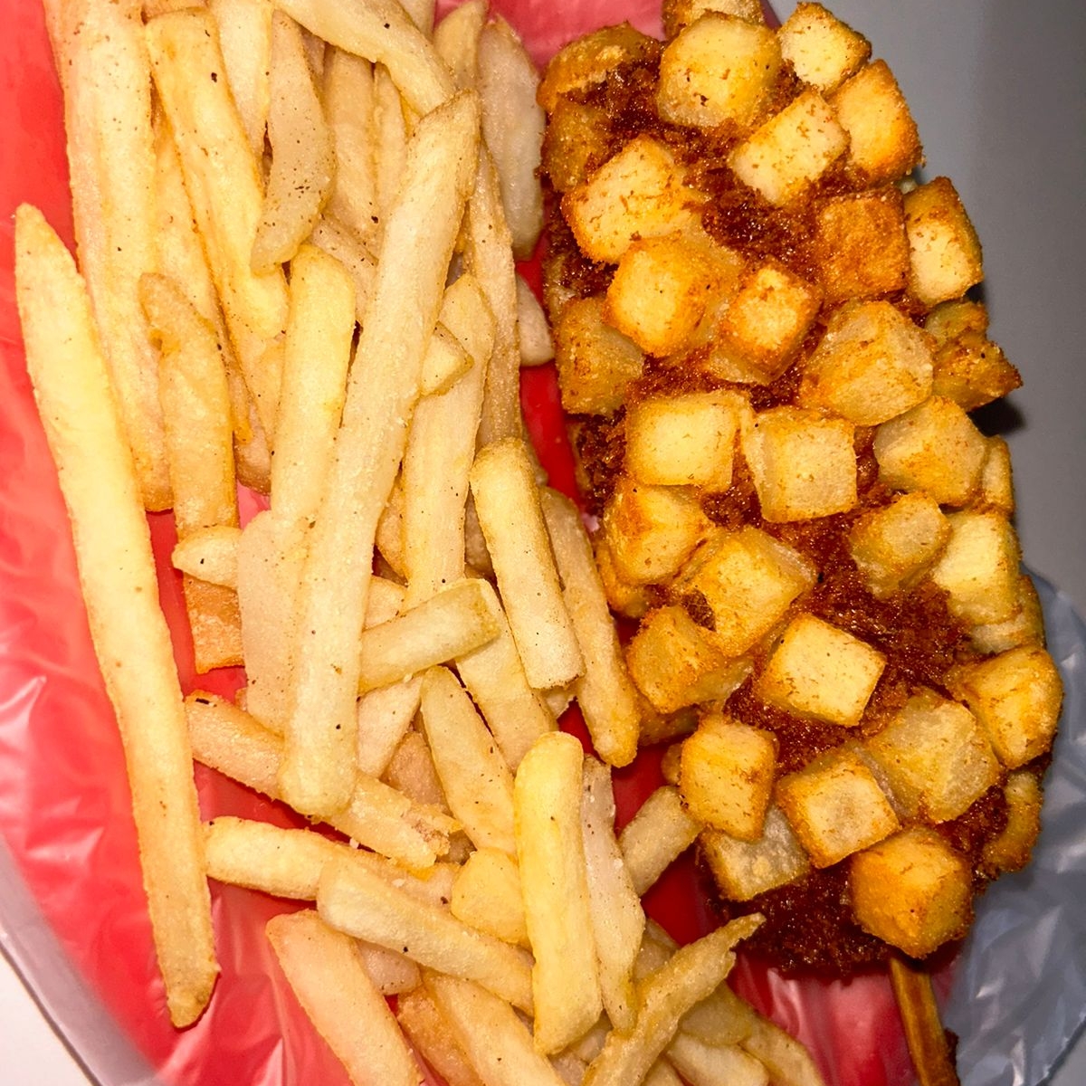 Salchicha de pavo Frankfurt cubierta de panko acompañada de papas fritas.
