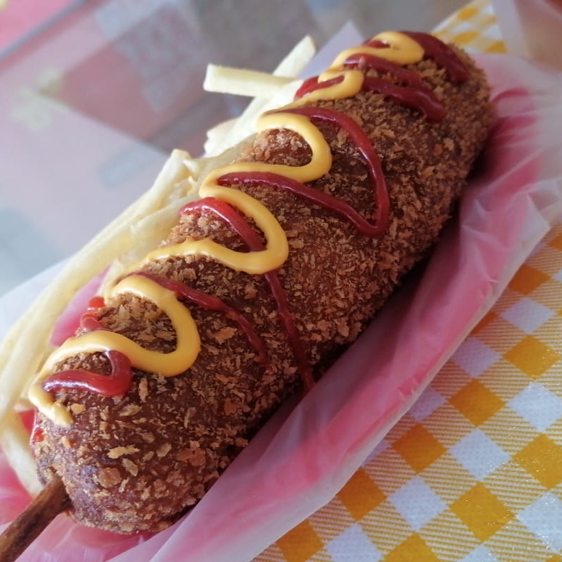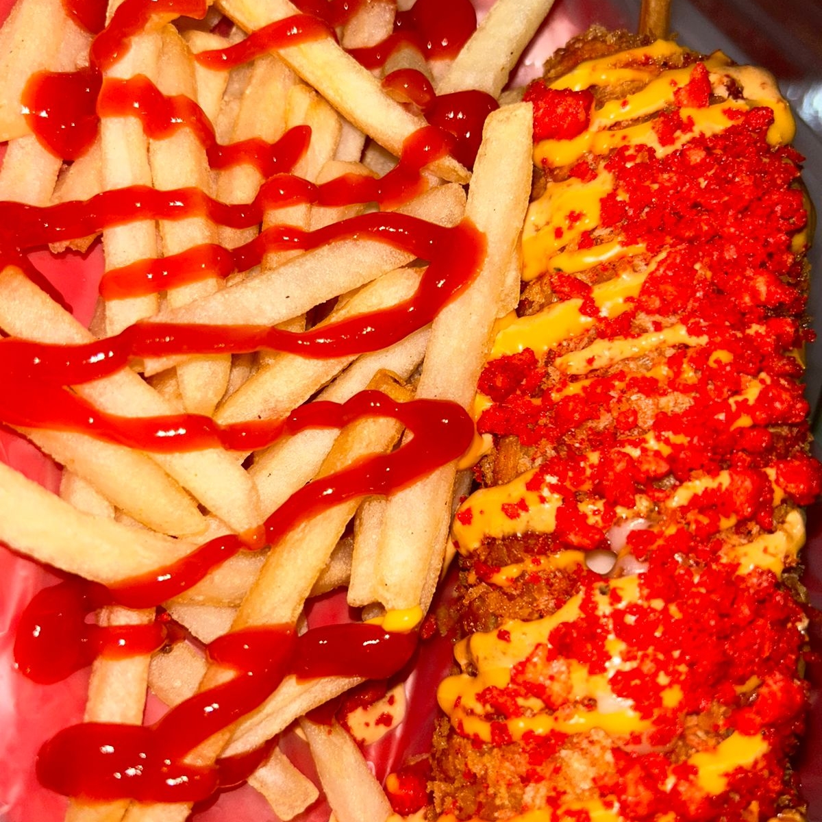Banderilla de salchicha roja frita cubierta de crujiente panko, acompañada de papas fritas