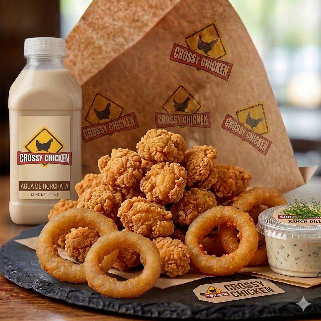 500 Gramos 6 Aros de cebolla 2 Aderezos 2 Agua de sabor