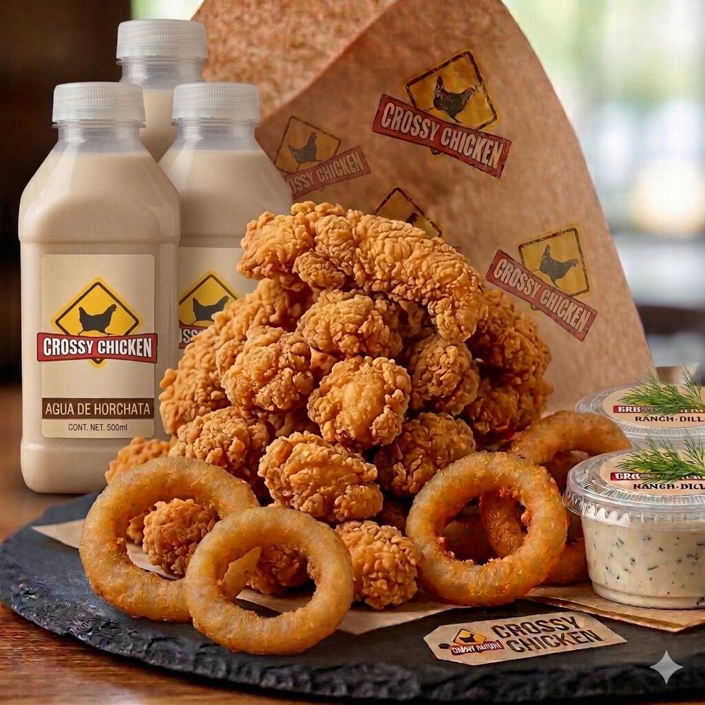 16 Tenders 12 Aros de cebolla 4 Aderezos 3 Agua de sabor