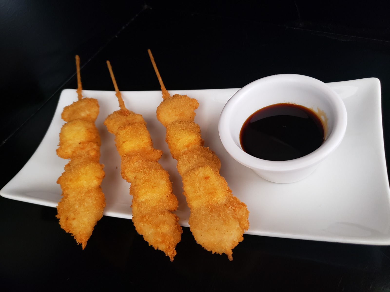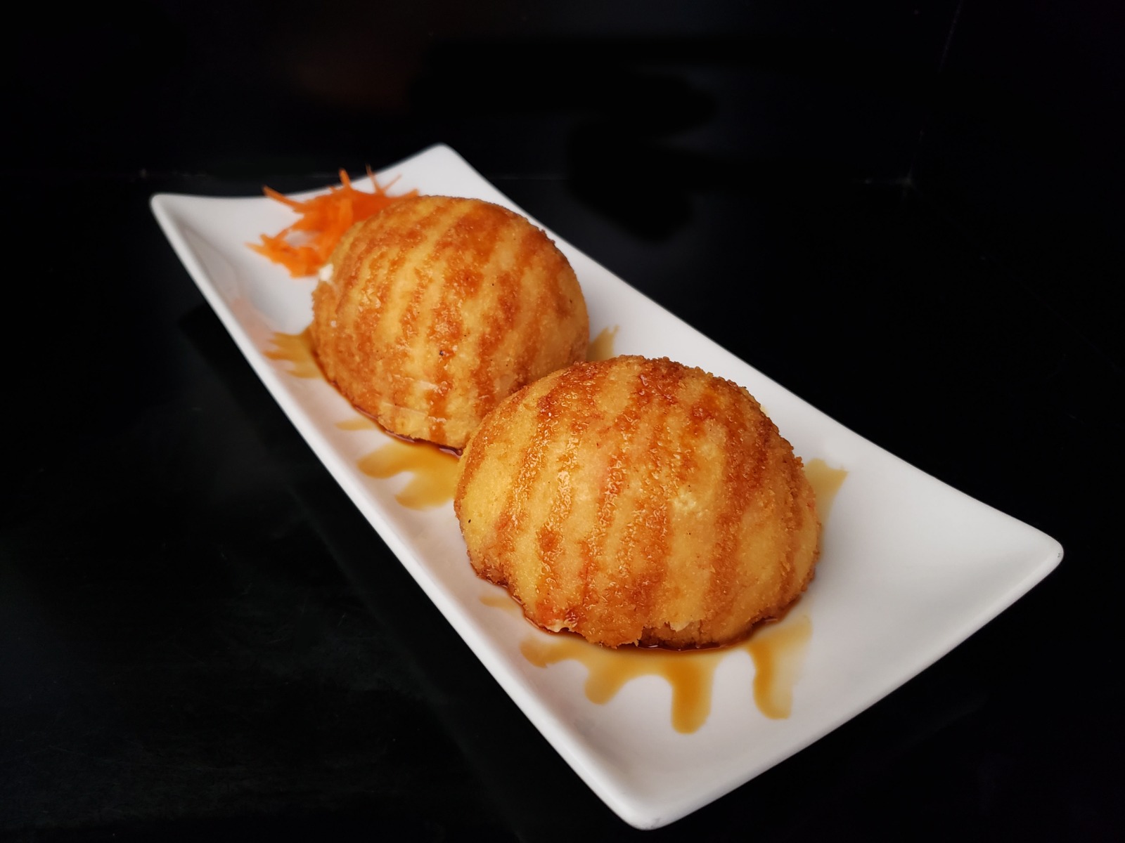 Bola de arroz empanizada, queso philadelphia, queso manchego, tampico, chile serrano, ingrediente a elegir, bañado en salsa de anguila y aderezo.