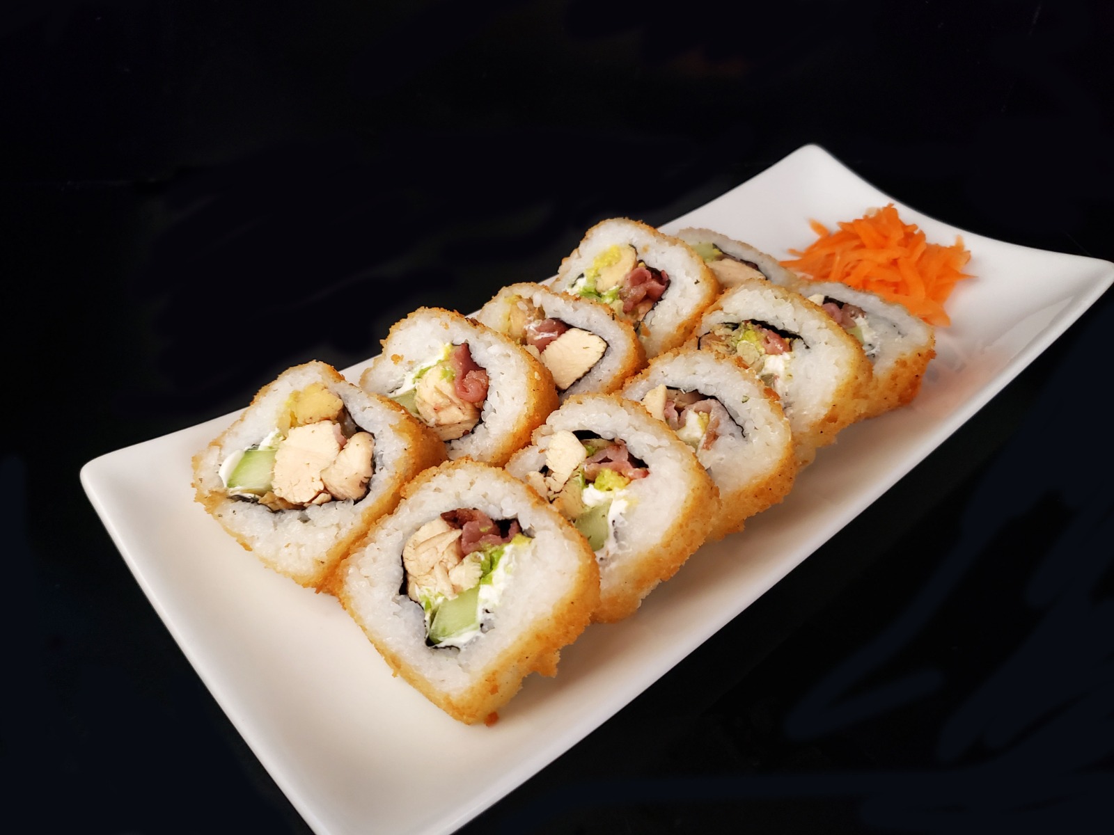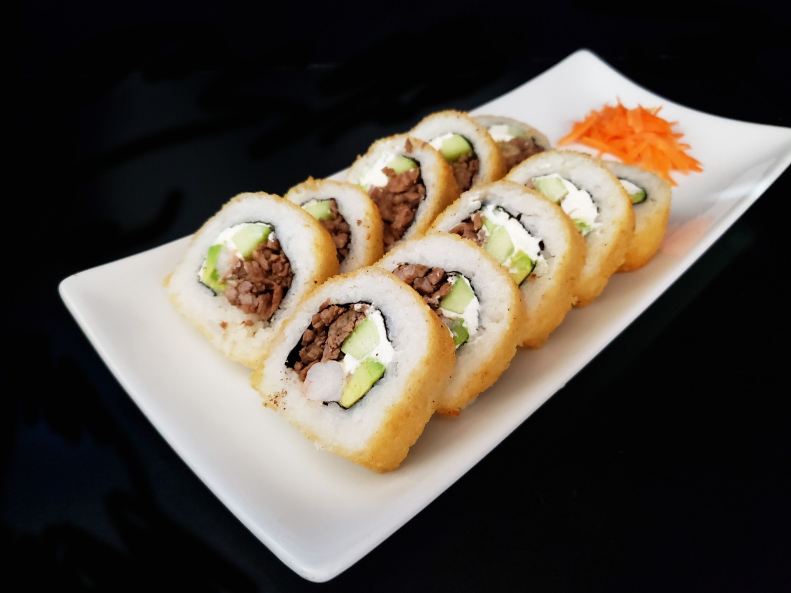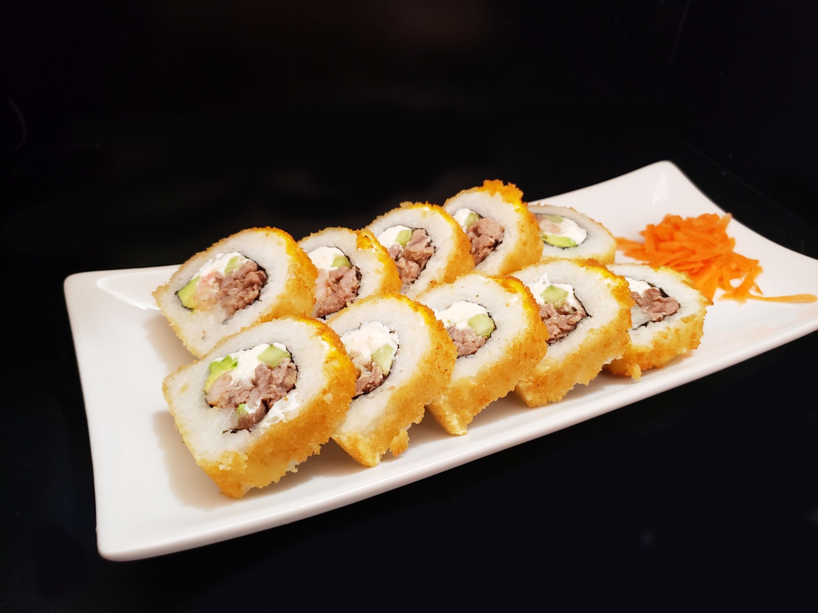 Por dentro philadelphia, aguacate, pepino, cangrejo y res, por fuera empanizado pieza por pieza acompañado con topping tampico.