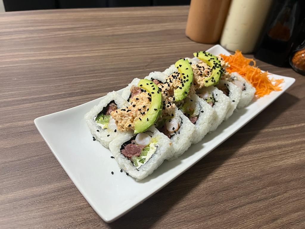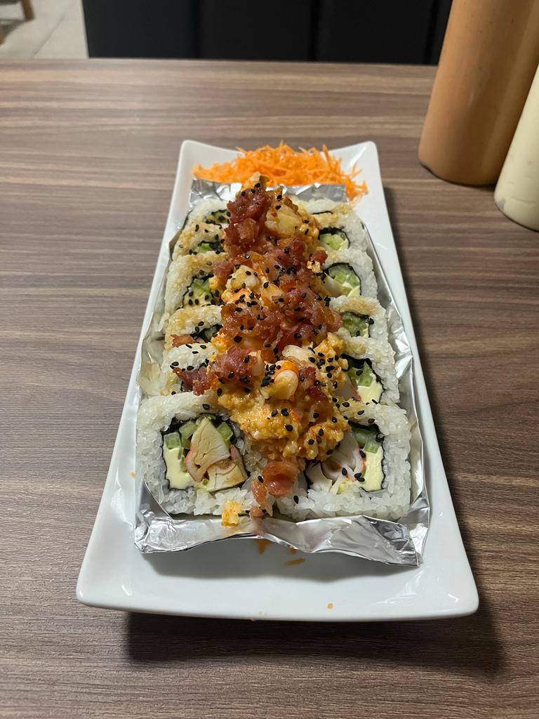 Por dentro philadelphia, aguacate, pepino y cangrejo, por fuera topping de camarón y tocino spicy bañado en salsa.