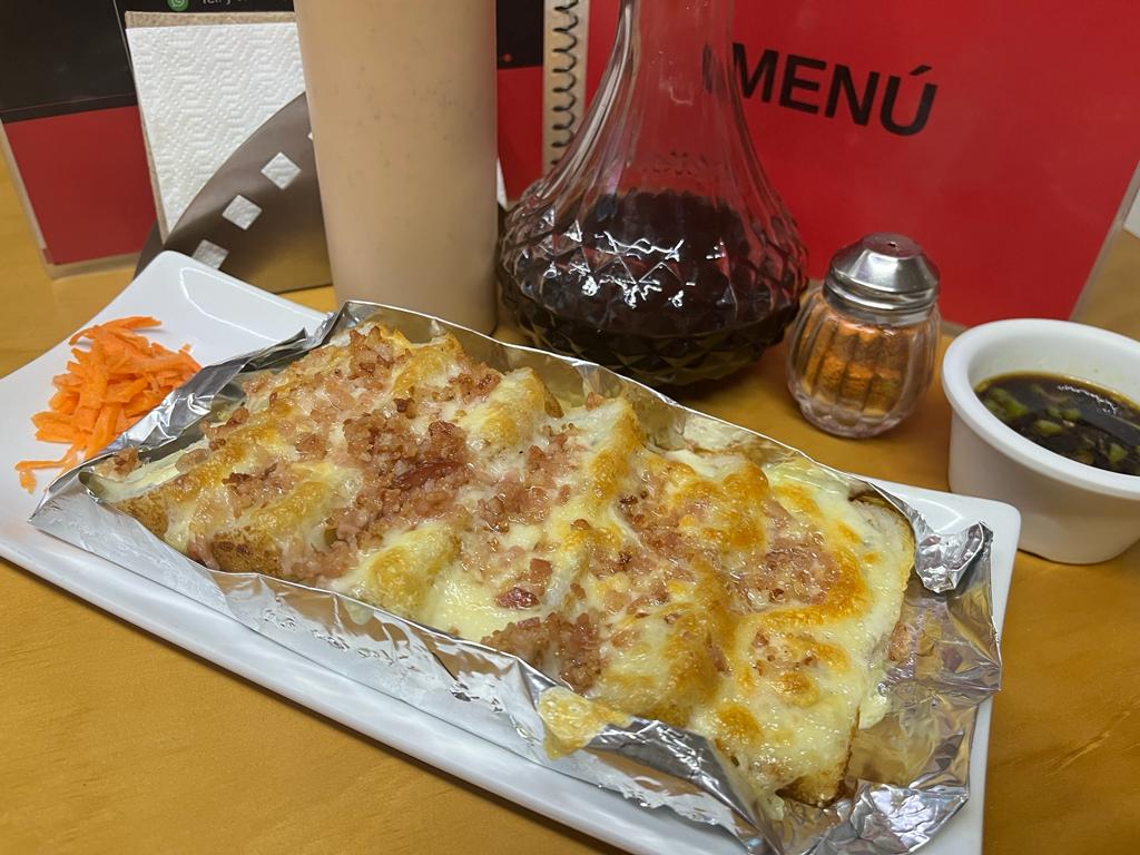 Rollo empanizado con queso philadelphia, aguacate, pepino y pollo por dentro, por fuera gratinado especial con res, camarón y tocino.