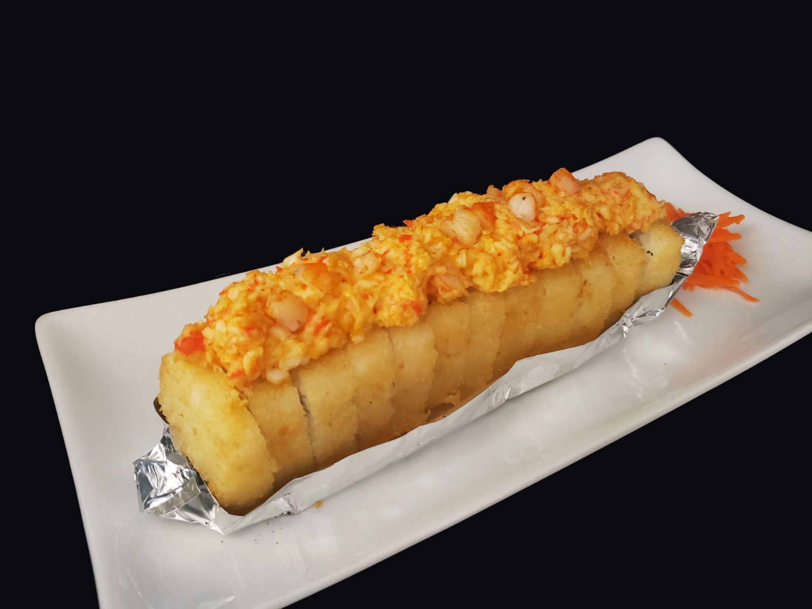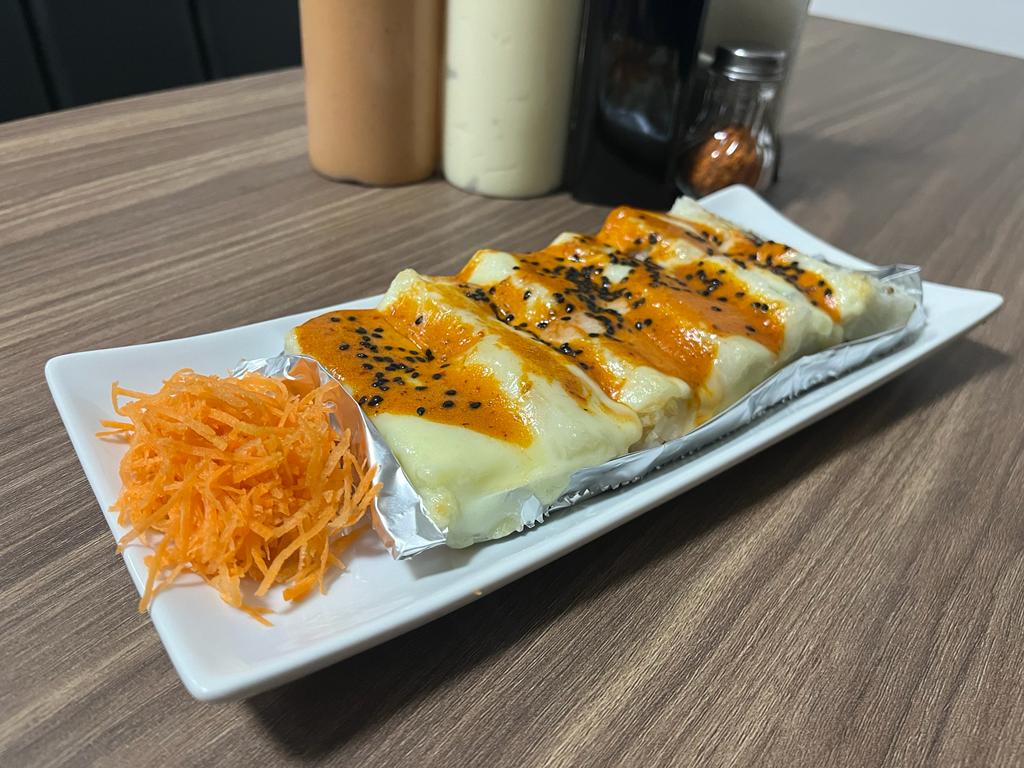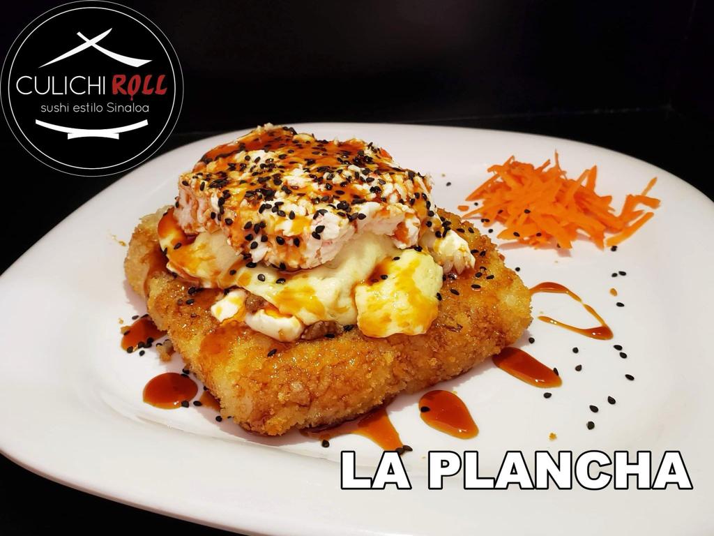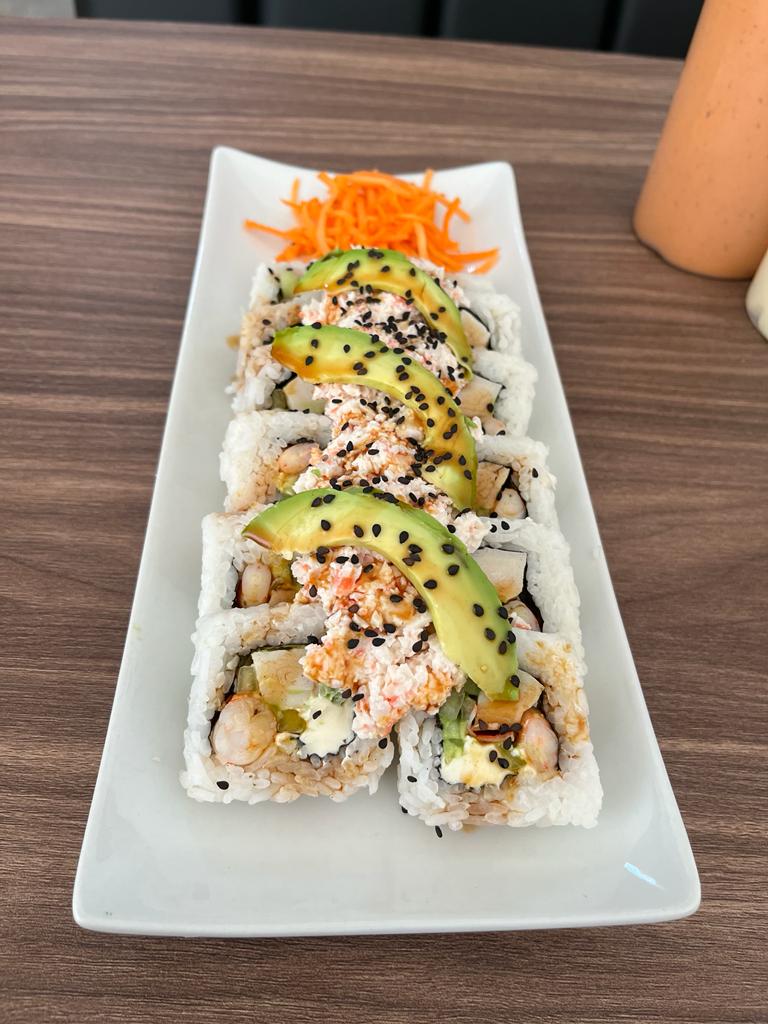 Por dentro philadelphia, aguacate, pepini, camarón empanizado, cangrejo, por fuera gratinado y bañado en aderezo chipotle.