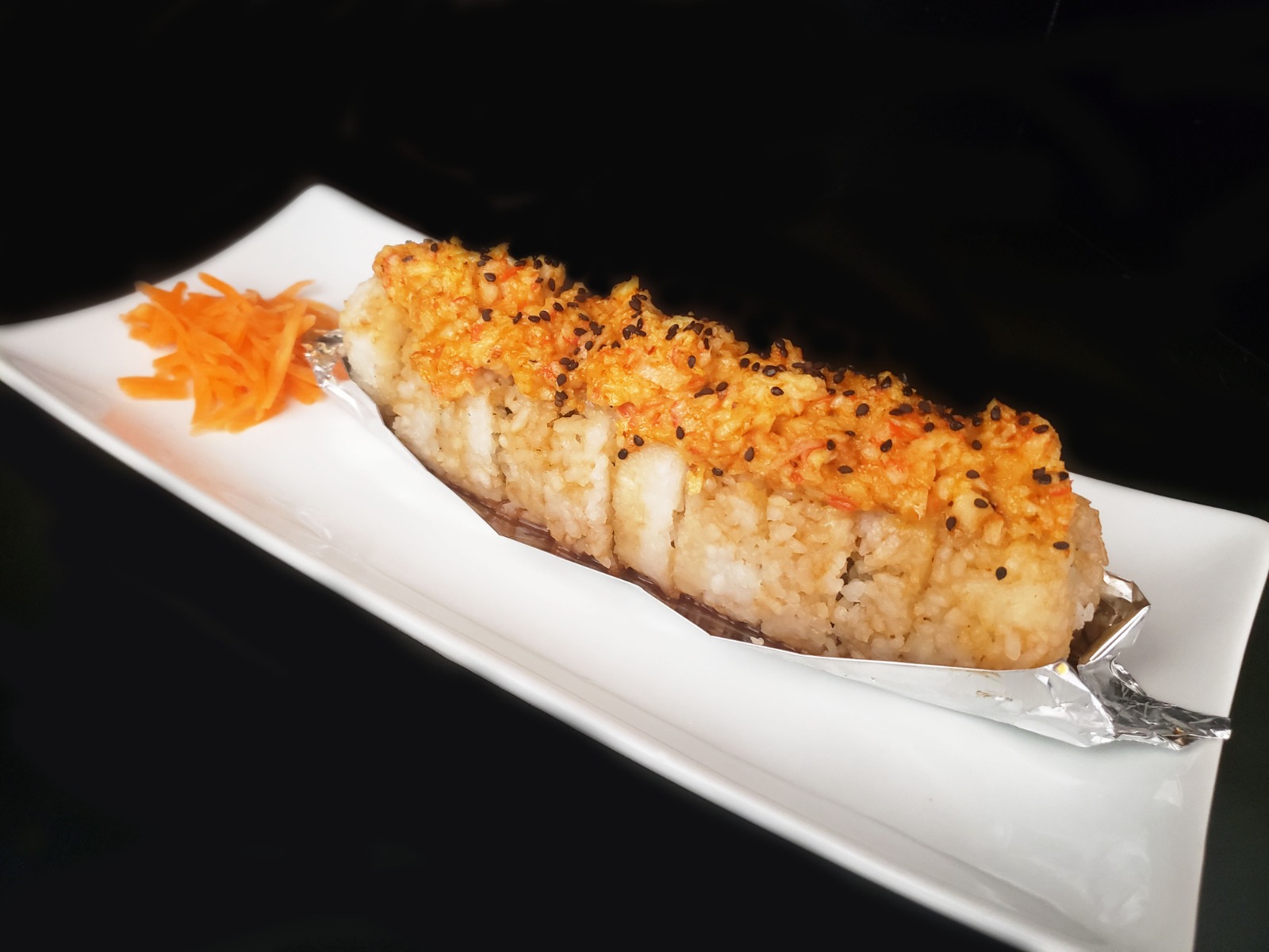 Por dentro queso philadelphia, aguacate, pepino, cangrejo y res, por fuera gratinado al horno bañado en aderezo chipotle y decorado con ajonjolí.