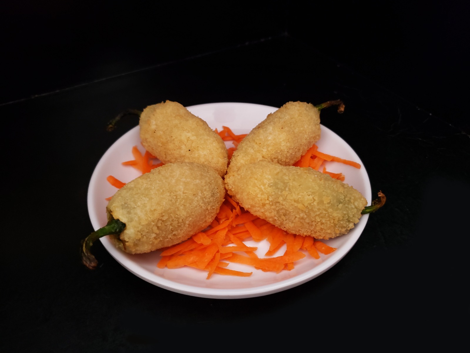 Orden de 4 chiles jalapeños, rellenos de queso philadelphia y res, empanizado.