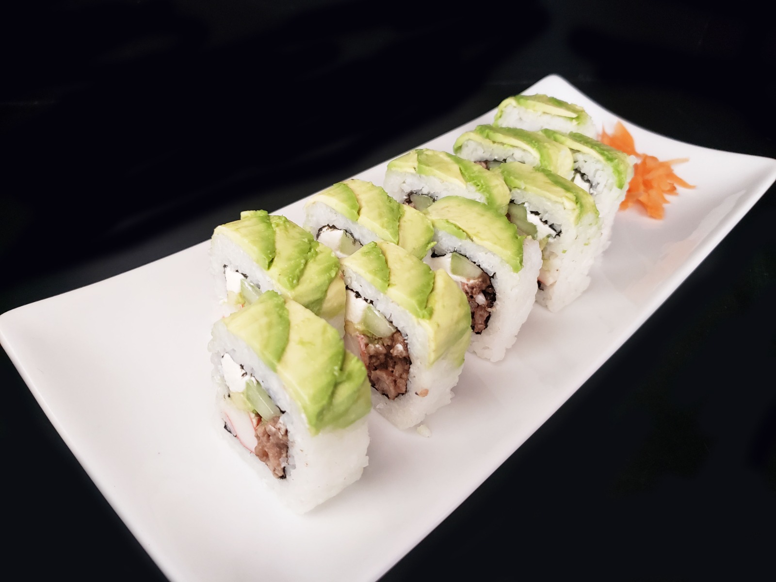 Por dentro philadelphia, aguacate, pepino, cangrejo y res, por fuera envuelto en aguacate.